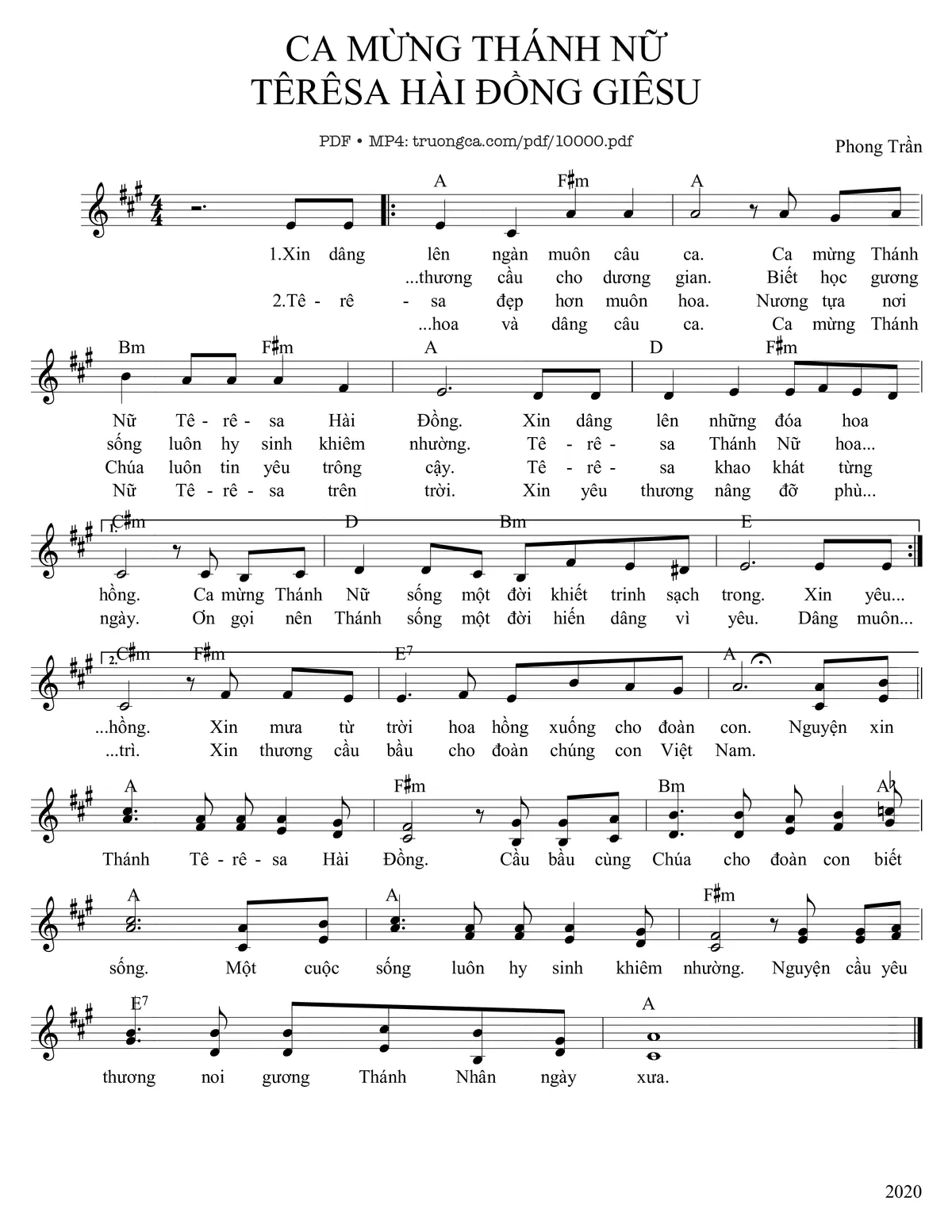 Lm. Phong Trần Xin dâng lên ngàn muôn câu ca Ca mừng Thánh nữ Têrêsa Hài Đồng [PDF] [Sheet] [Lời H.A] [Mp4/Midi]