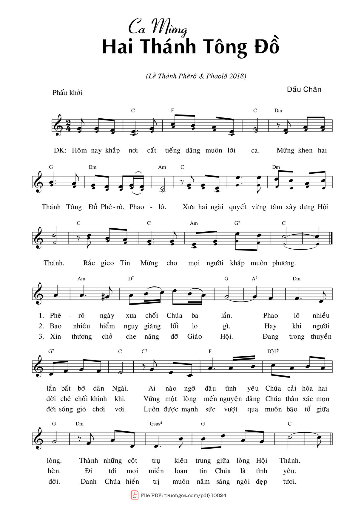 Điệp khúc. Hôm nay khắp nơi cất tiếng dâng muôn lời ca. Mừng khen hai Thánh Tông đồ Phê-rô, Phao-lô. Xưa hai ngài quyết vững tâm xây dựng Hội Thánh. Rắc gieo Tin Mừng cho mọi người khắp muôn phương.