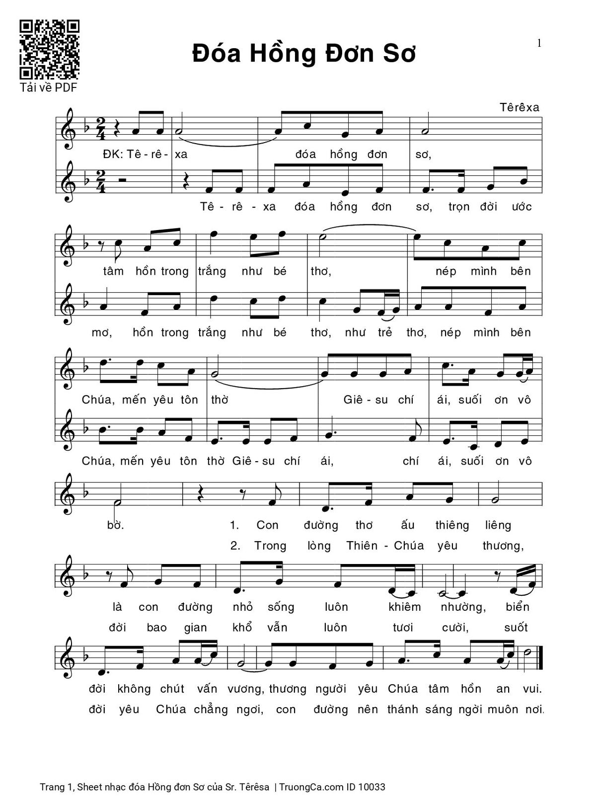 Điệp khúc. Tê-rê-sa đóa hồng đơn sơ, tâm hồn trong trắng như bé thơ, nép mình bên Chúa, mến yêu tôn thờ. Giê-su chí ái, suối ơn vô bờ.