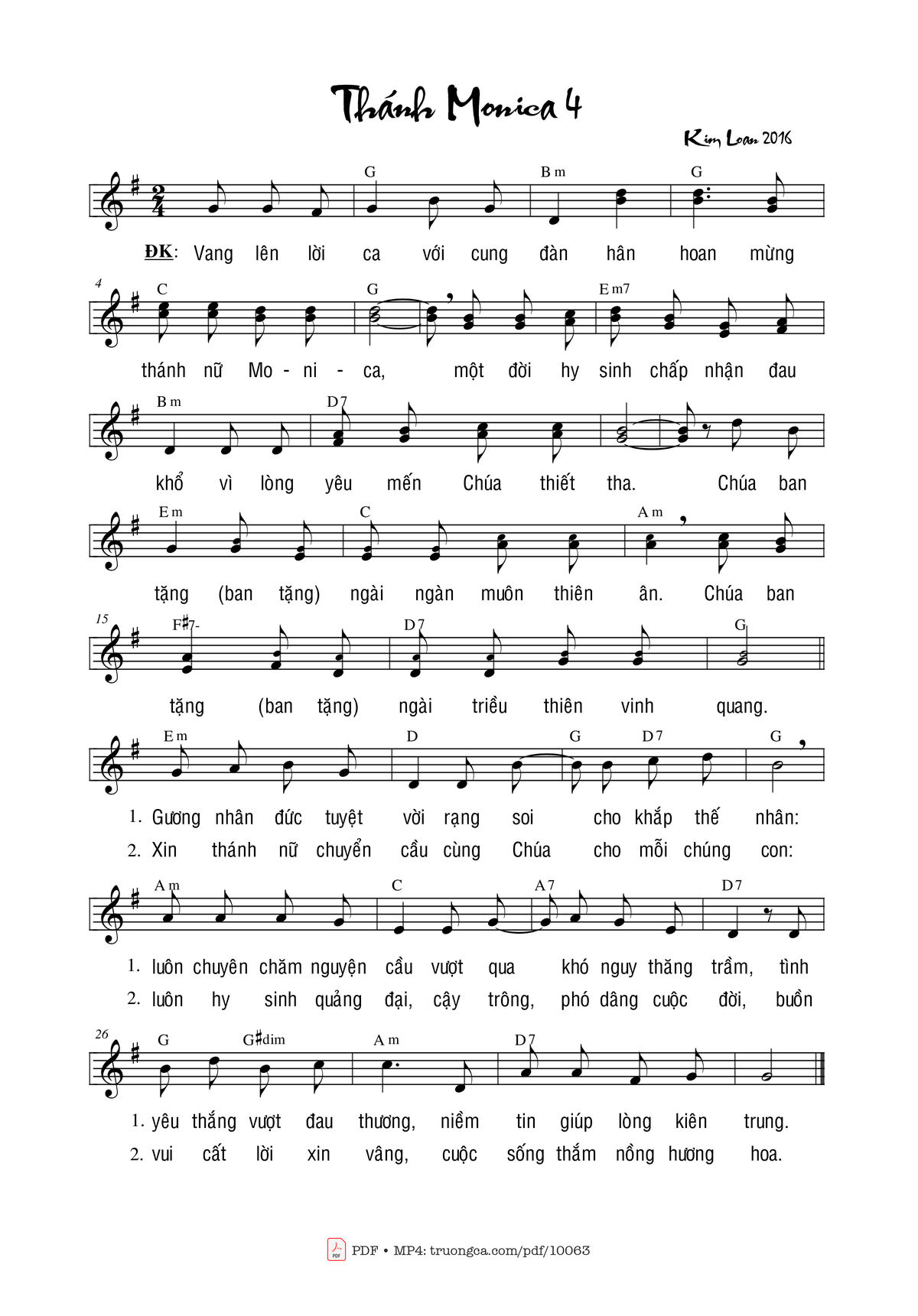 Điệp khúc. Vang lên lời ca với cung đàn hân hoan mừng thánh nữ Monica. Một đời hy sinh chấp nhận đau khổ vì lòng yêu mến Chúa thiết tha. Chúa ban tặng (ban tặng) ngài ngàn muôn thiên ân. Chúa ban tặng (ban tặng) ngài triều thiên vinh quang.
