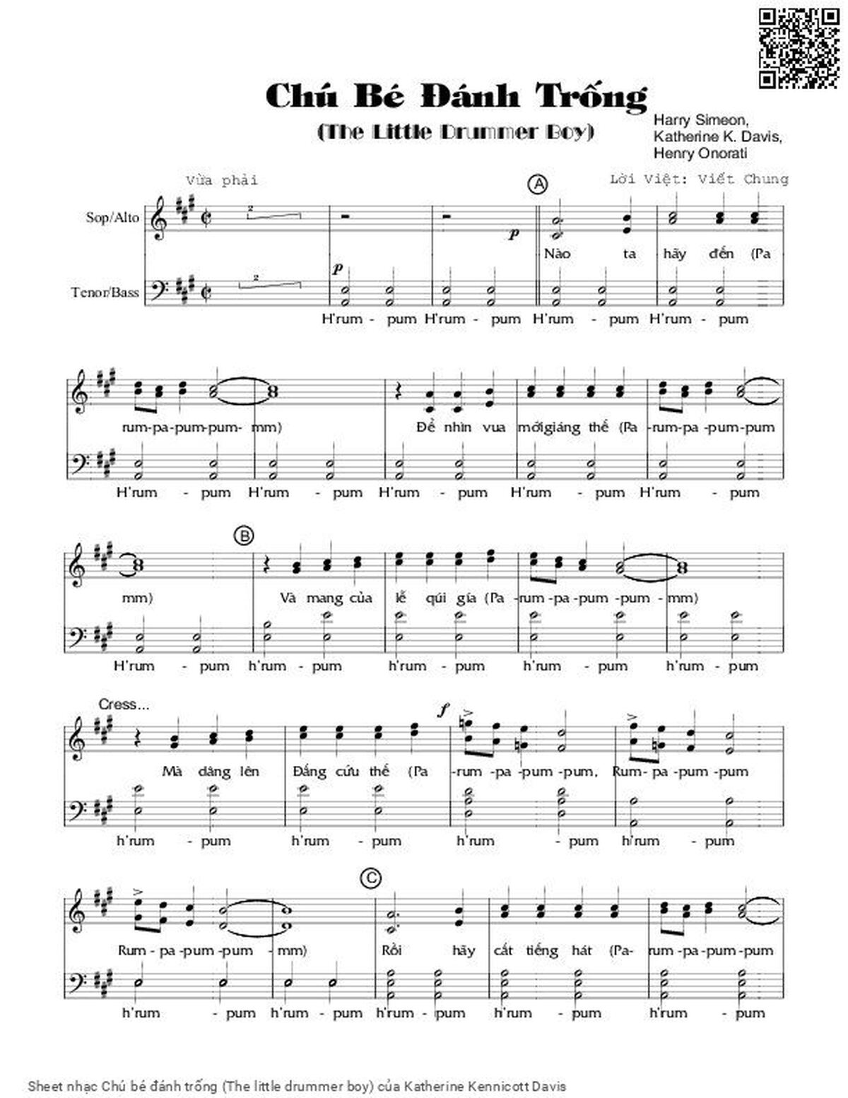 Phần nghe hát Chú bé đánh trống (The little drummer boy) (Katherine Kennicott Davis) được nhúng từ Youtube, Musescore hoặc link ngoài và chịu sự kiểm soát bản quyền của bên thứ ba đó, vì vậy có thể bị xóa hoặc chèn quảng cáo bất kỳ lúc nào. Nếu bạn không nghe - xem được ca sĩ hát tức là đã bị Youtube hoặc Musescore kiểm soát.