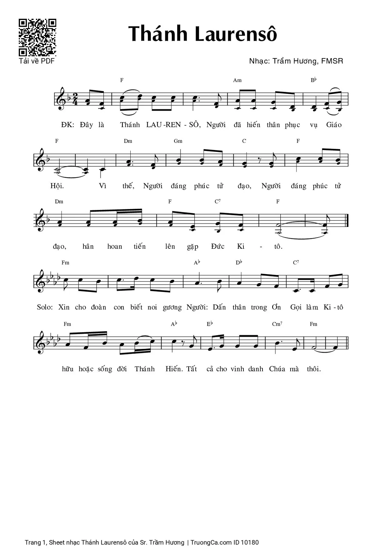 Chọn nút dấu + để tăng tông lên nửa cung, nút dấu - để giảm tông xuống nửa cung. Rê chuột vào hợp âm để xem các thế bấm hợp âm của bài hát Thánh Laurensô.