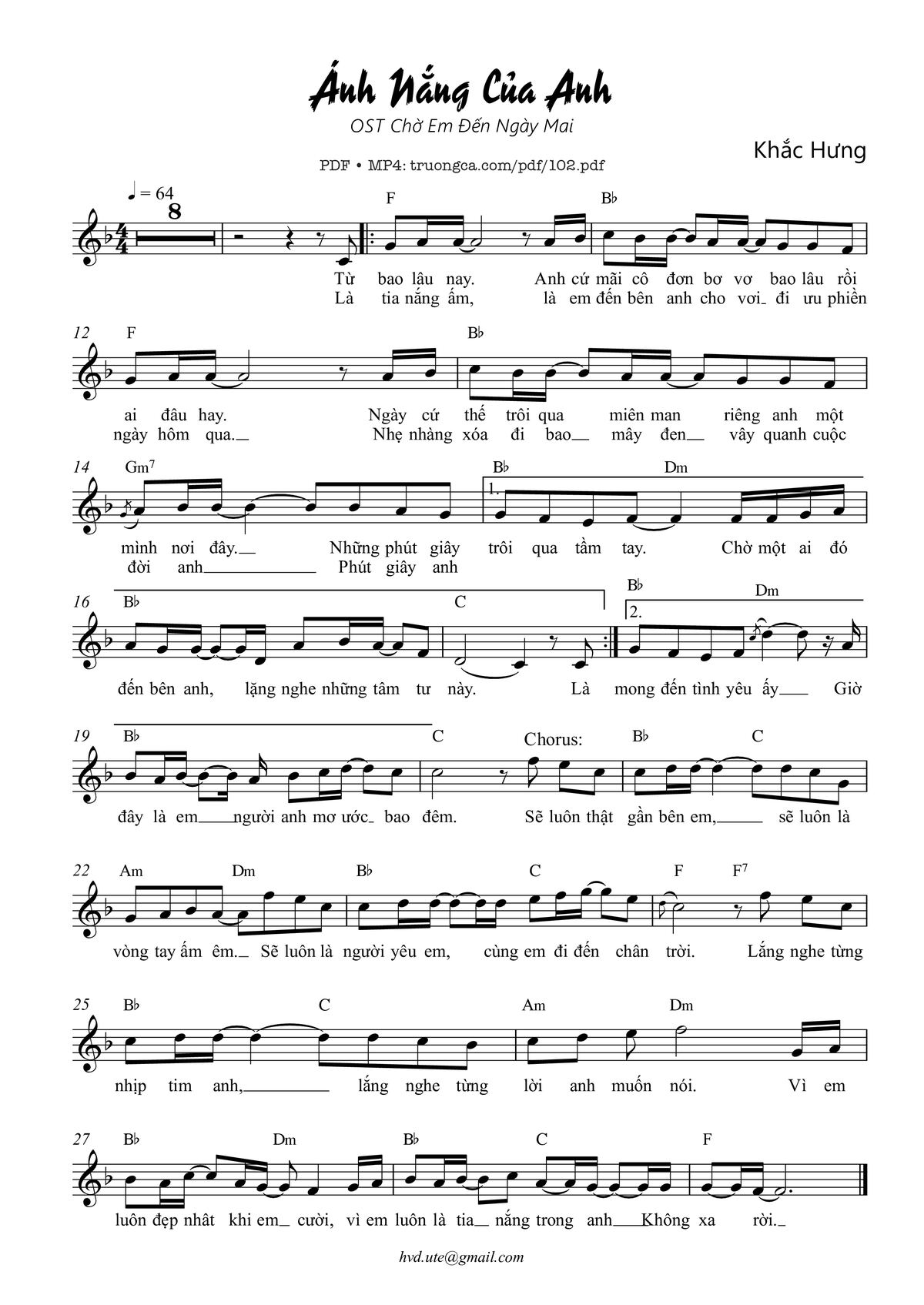 Phần nghe hát Ánh nắng của anh (Khắc Hưng) được nhúng từ Youtube, Musescore hoặc link ngoài và chịu sự kiểm soát bản quyền của bên thứ ba đó, vì vậy có thể bị xóa hoặc chèn quảng cáo bất kỳ lúc nào. Nếu bạn không nghe - xem được ca sĩ hát tức là đã bị Youtube hoặc Musescore kiểm soát.
