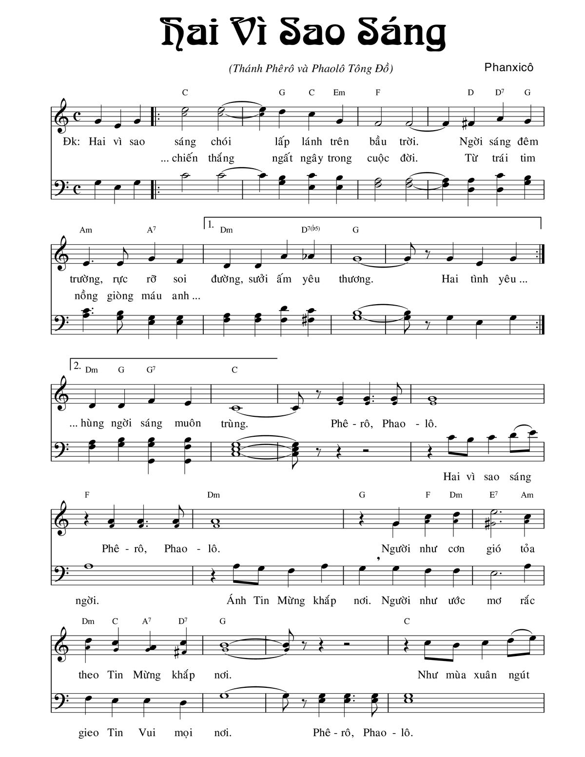 Điệp khúc. Hai vì sao sáng chói lấp lánh trên bầu trời. Ngời sáng đêm trường, rực rỡ soi đường, sưởi ấm yêu thương. Hai tình yêu chiến thắng ngất ngây trong cuộc đời. Từ trái tim nồng giòng máu anh hùng ngời sáng muôn trùng. Phêrô – Phaolô. (Hai vì sao sáng ngời) Phêrô – Phaolô. (Ánh Tin Mừng khắp nơi). Người như cơn gió toả theo Tin Mừng khắp nơi. (Phêrô – Phaolô) Như mùa xuân ngút ngàn. (Phêrô – Phaolô) Giáo Hội vinh quang. Nhờ hai phiến đá ngàn (muôn) năm Giáo Hội vinh quang.