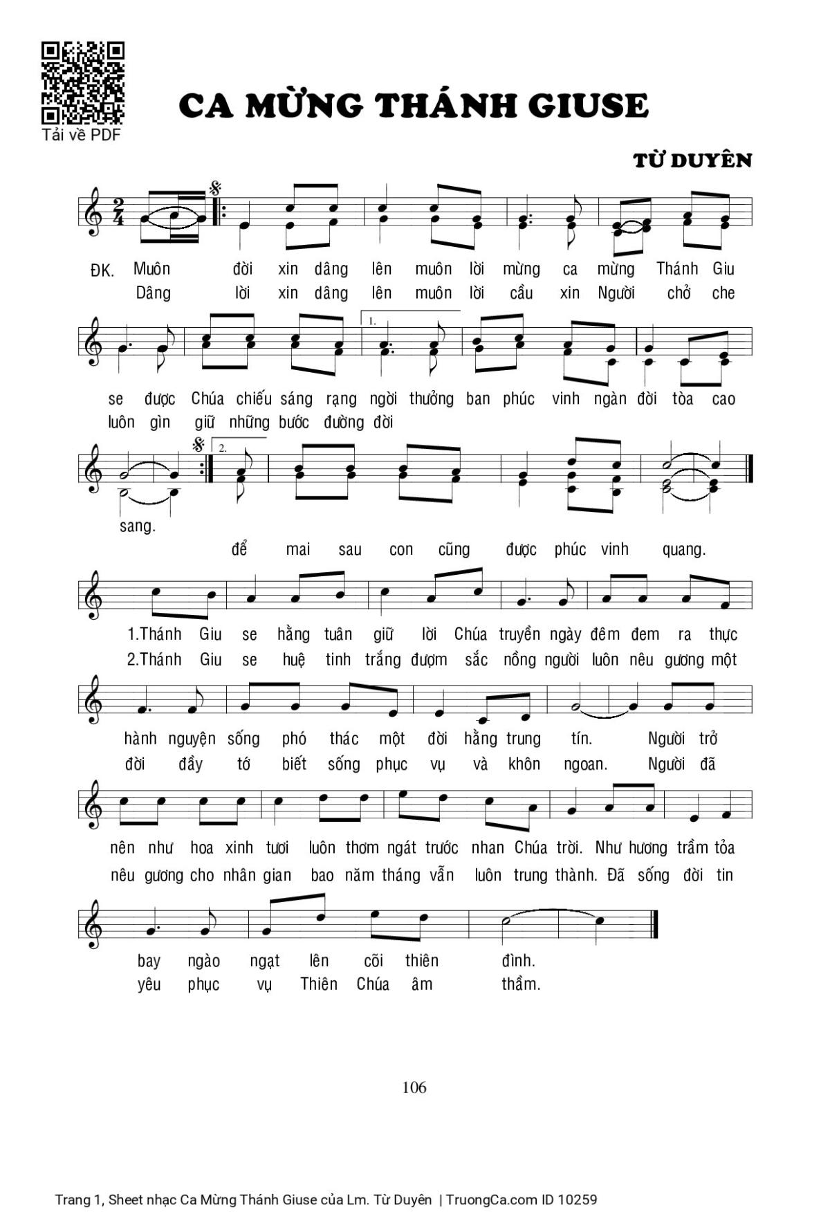 Điệp khúc: Muôn đời xin dâng lên muôn lời mừng ca, mừng Thánh Giu-se được Chúa chiếu sáng rạng ngời thưởng ban phúc vinh ngàn đời tòa cao sang. Dâng lời xin dâng lên muôn lời cầu xin Người chở che luôn gìn giữ những bước đường đời để mai sau con cũng được phúc vinh quang.