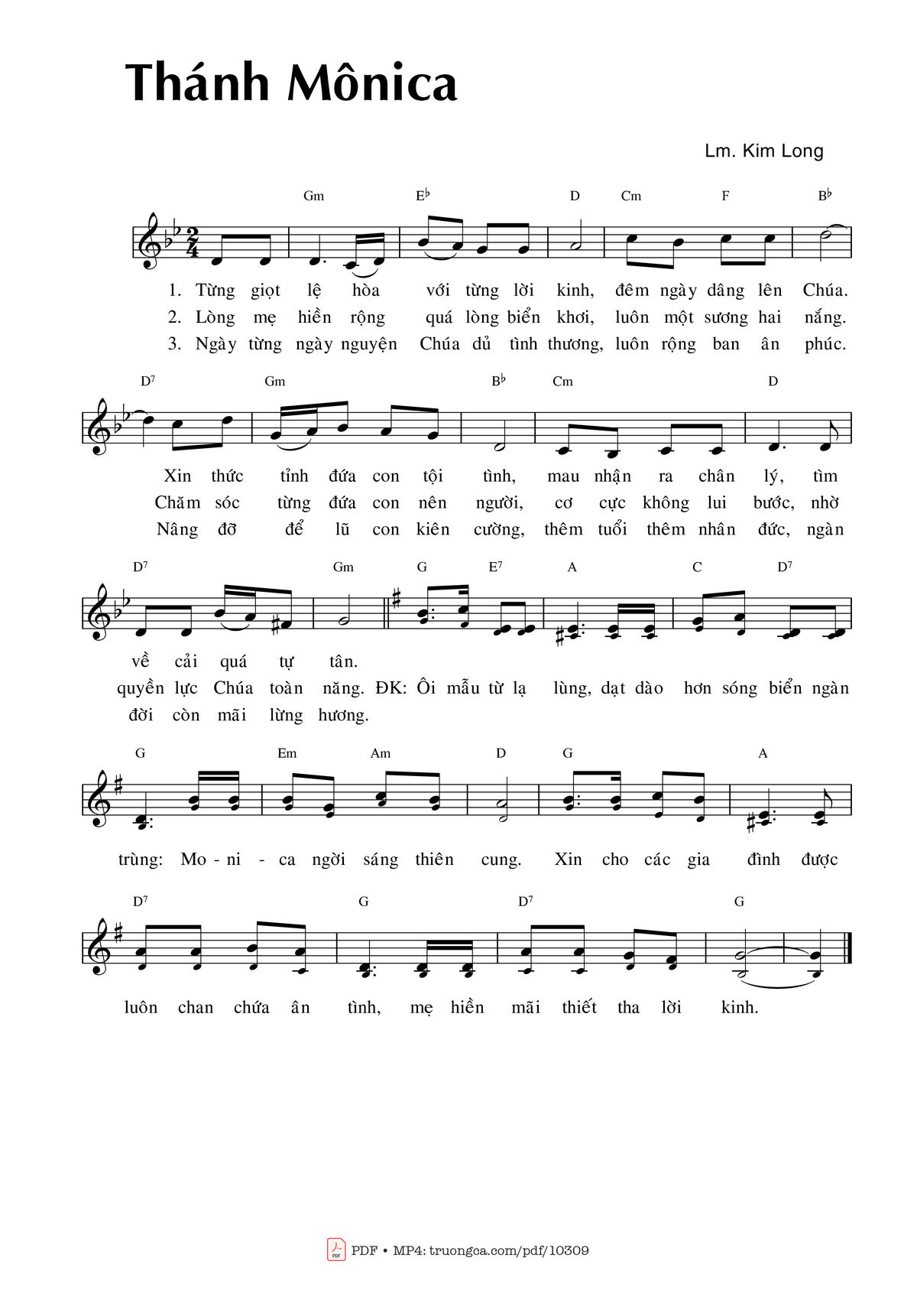 Điệp khúc. Ôi mẫu từ lạ lùng, dạt dào hơn sóng biển ngàn trùng: Mo-ni-ca ngời sáng thiên cung. Xin cho các gia đình được luôn chan chứa ân tình, mẹ hiền mãi thiết tha lời kinh.