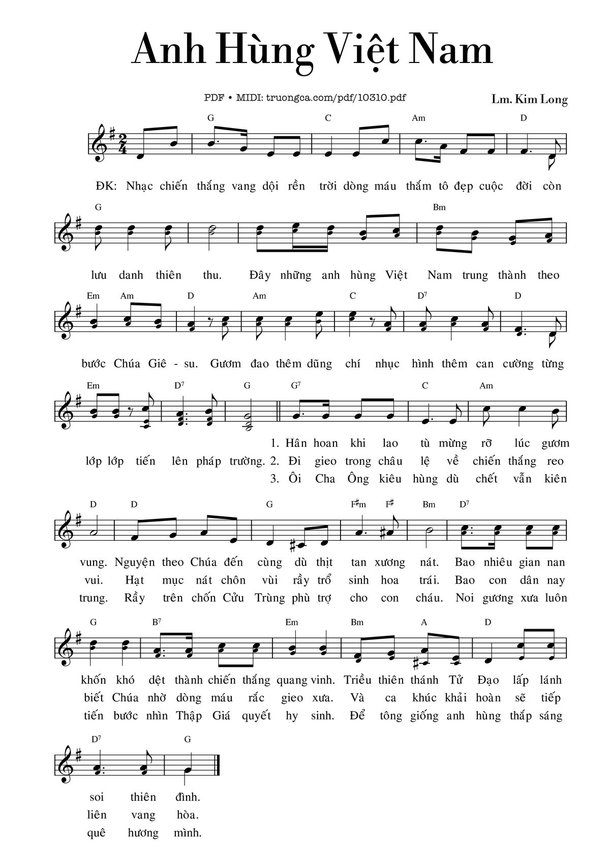 Điệp khúc. Nhạc chiến thắng vang dậy rền trời, dòng máu thắm tô đẹp cuộc đời, còn lưu danh thiên thu. Đây những anh hùng Việt Nam trung thành theo bước Chúa Giê-su. gươm đao thêm dũng chí, nhục hình thêm can trường. Từng lớp lớp tiến lên pháp trường.