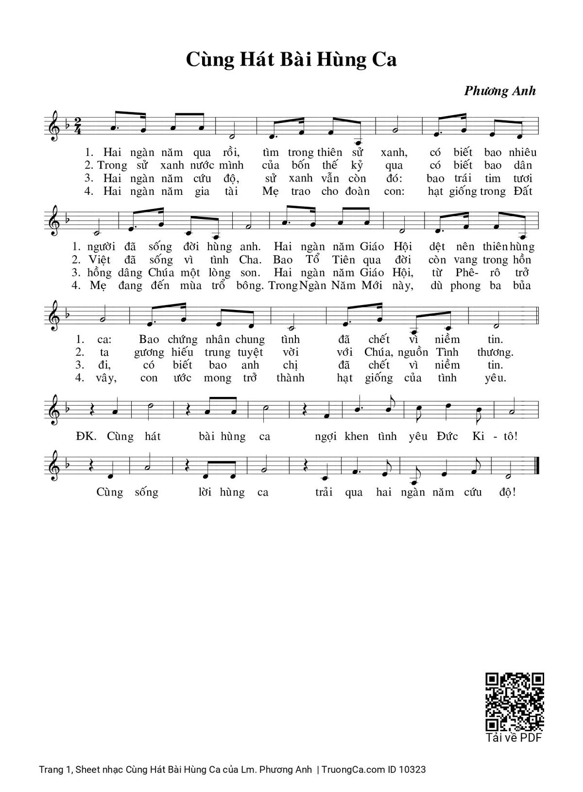 Điệp khúc. Cùng hát bài hùng ca ngợi khen tình yêu Đức Ki-tô! Cùng sống lời hùng ca trải qua hai ngàn năm cứu độ!