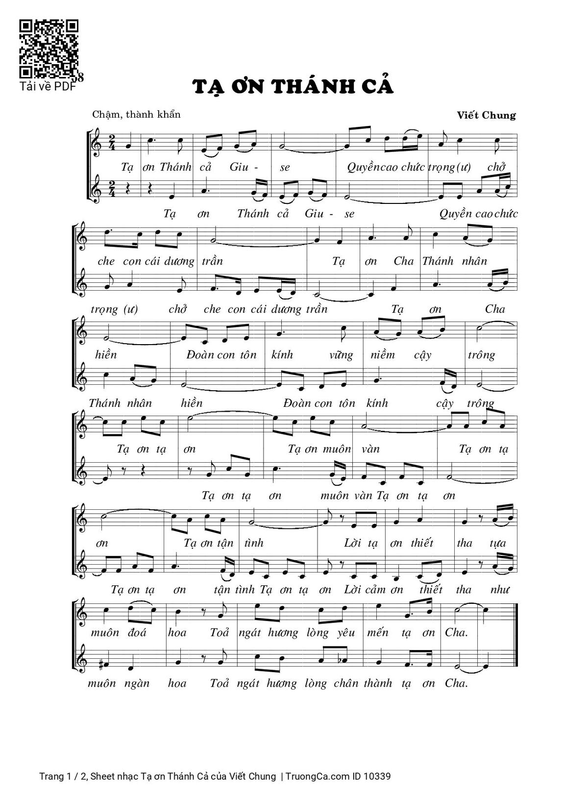 Điệp khúc. Tạ ơn Thánh Cả Giu-se quyền cao chức trọng chở che con cái dương trần . Tạ ơn Cha Thánh nhân hiền đoàn con tôn kính vững niềm cậy trông. Tạ ơn, tạ ơn Tạ ơn muôn vàn Tạ ơn tạ ơn Tạ ơn tận tình Lời tạ ơn thiết tha tựa muôn đóa hoa, tỏa ngát hương lòng mến yêu, tạ ơn Chúa.