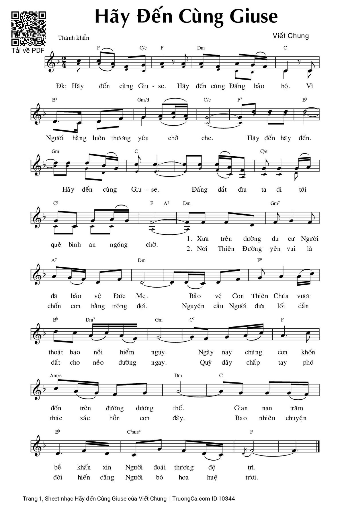 Điệp khúc. Hãy đến cùng Giu-se, hãy đến cùng Đấng bảo hộ, vì Người hằng luôn thương yêu chở che, hãy đến hãy đến. Hãy đến cùng Giu-se Đấng dắt dìu ta đi tới quê bình an ngóng chờ.