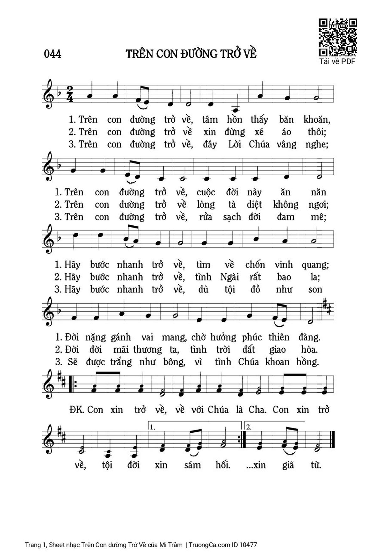 1. Trên con đường trở về, tâm hồn thấy băn khoăn. Trên con đường trở về, cuộc đời này ăn năn. Hãy bước nhanh trở về, tìm về chốn vinh quang. Đời nặng gánh vai mang, chờ hưởng phúc thiên đàng.