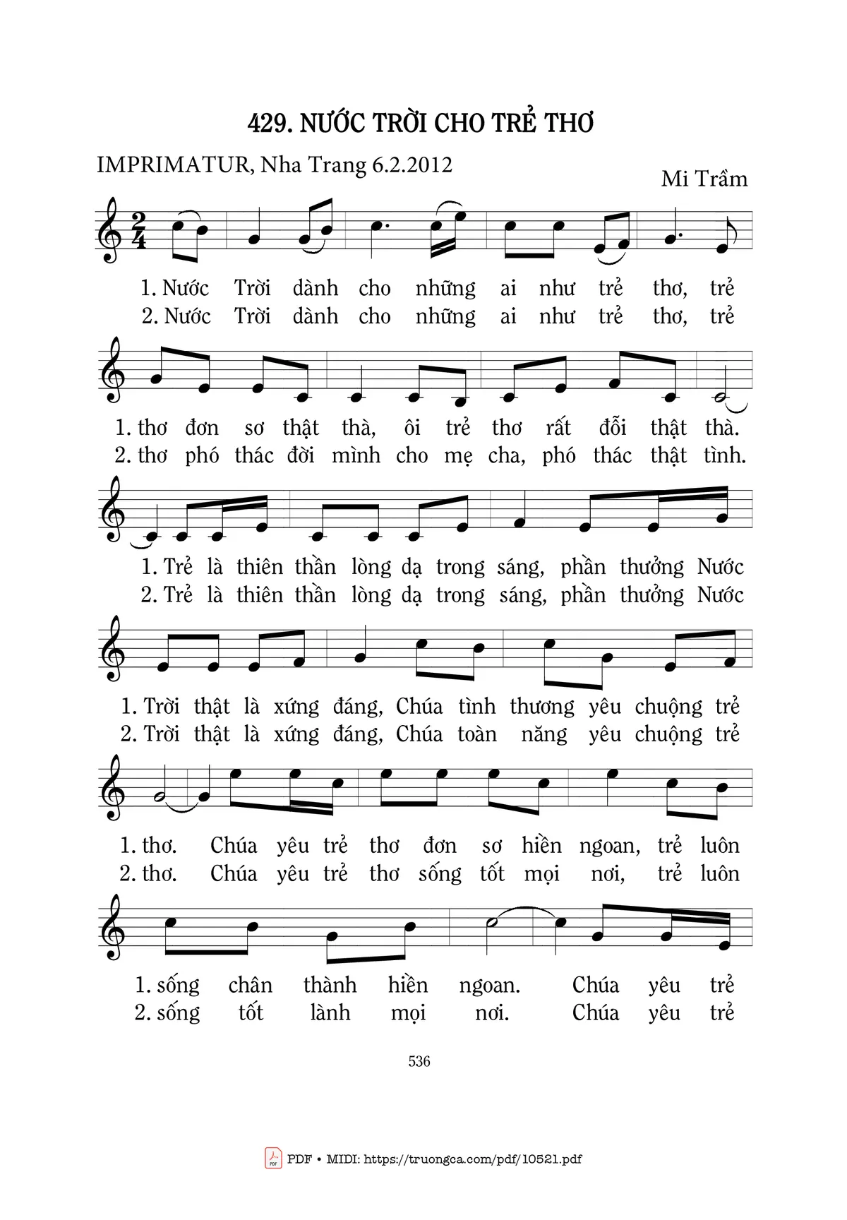 🌾 Thông tin chuẩn nhận dùng trong phụng vụ Công Giáo: Nhạc Thiếu Nhi. Imprimatur – Gp.Nha Trang: 06.02.2012