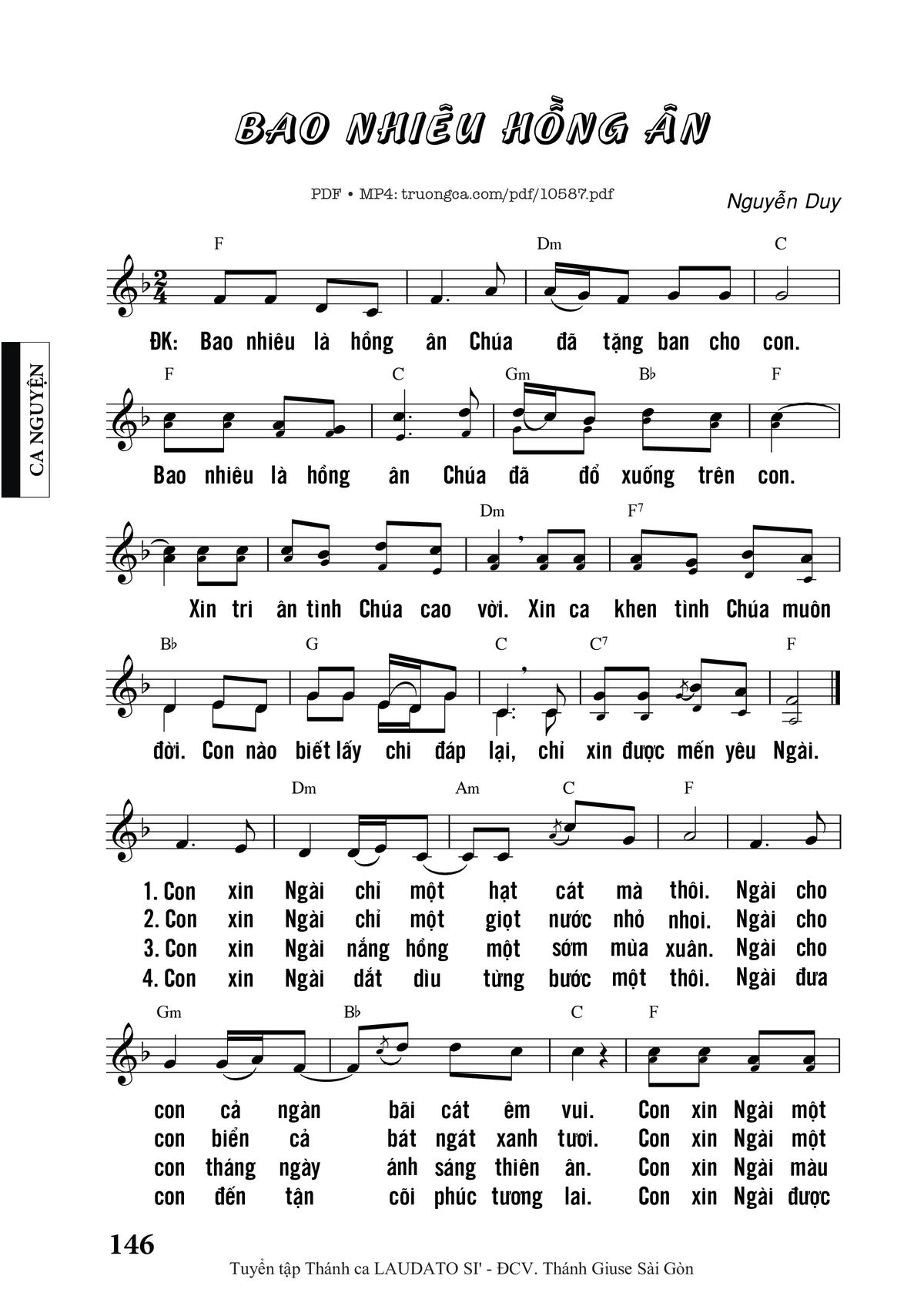 Điệp khúc. Bao nhiêu là hồng ân Chúa đã tặng ban cho con. Bao nhiêu là hồng ân Chúa đã đổ xuống trên con. Xin tri ân tình Chúa cao vời, xin ca khen tình Chúa muôn đời. Con nào biết lấy chi đáp lại, chỉ xin được mến yêu Ngài.