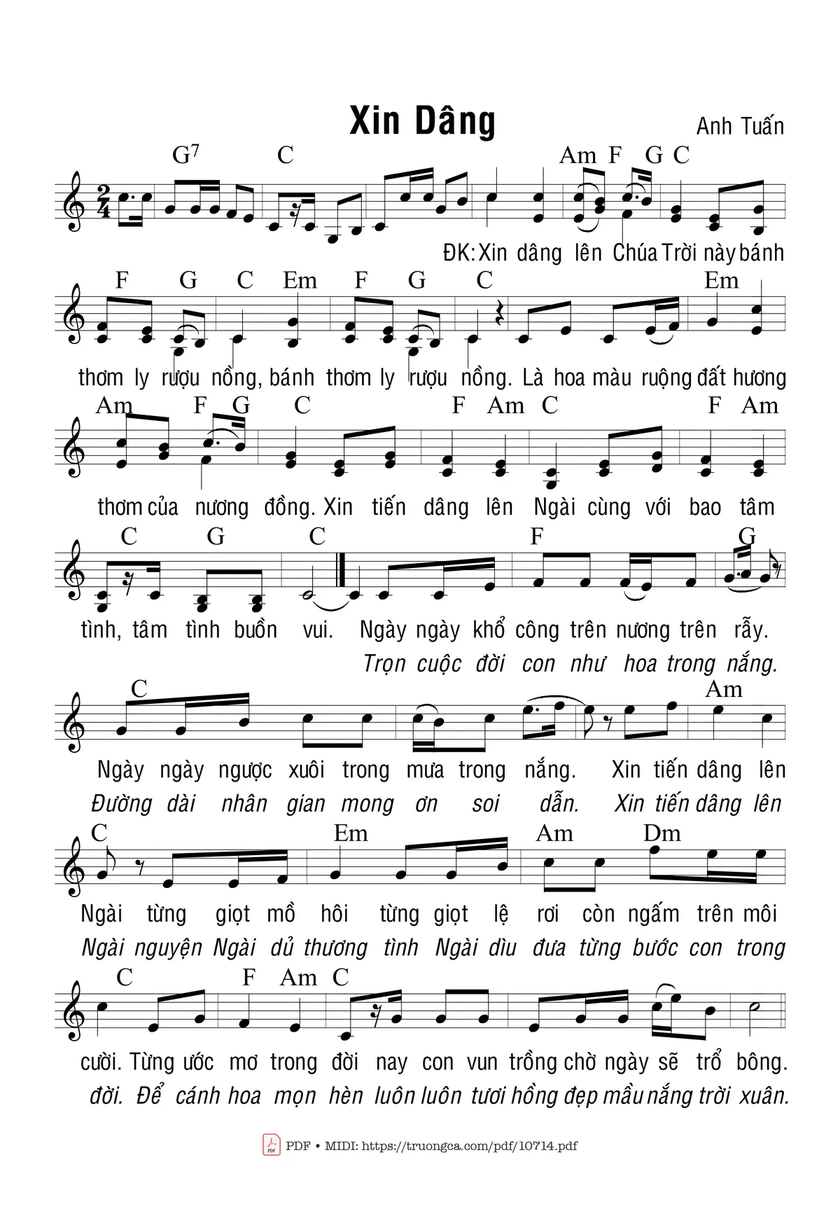 Điệp khúc: Xin dâng lên Chúa Trời này bánh thơm ly rượu nồng . Là hoa màu ruộng đất hương thơm của nương đồng. xin tiến dâng lên Ngài cùng với bao tâm tình tâm tình buồn vui.