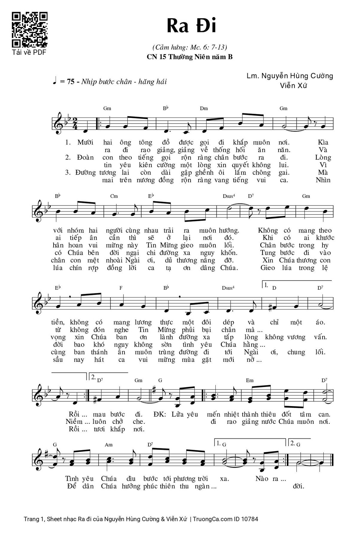 1. Mười hai ông tông đồ được gọi đi khắp muôn nơi. Kìa với nhóm hai người cùng nhau trải ra muôn hướng. Không có mang theo tiền, không có mang lương thực một đôi dép và chỉ một áo. Rồi ra đi rao giảng, giảng về thống hối ăn năn. Và ai tiếp ân cần thì sẽ ở lại nơi đó. Khi có ai khước từ không đón nghe Tin Mừng phủi bụi chân mà mau bước đi.