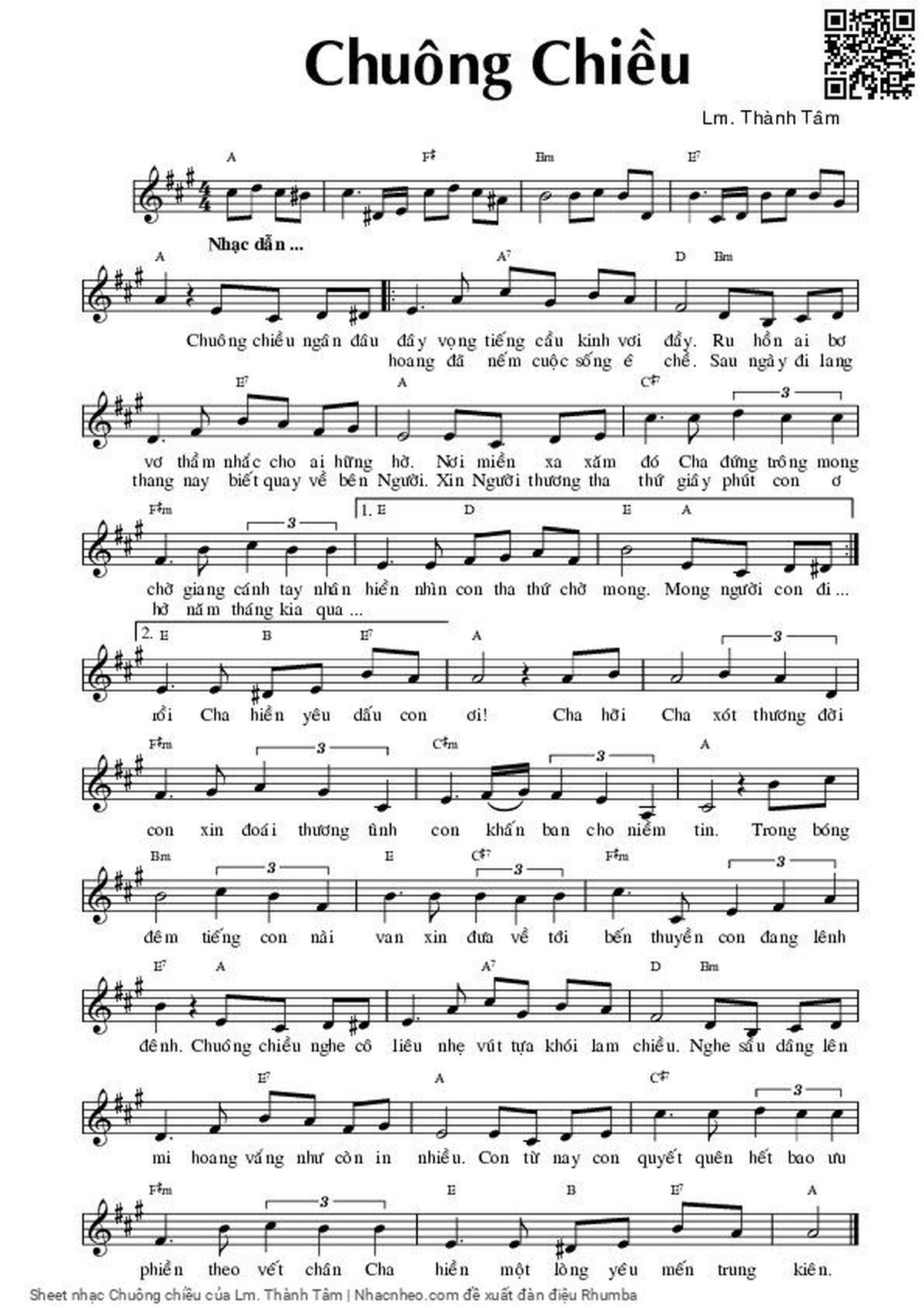 Chọn nút dấu + để tăng tông lên nửa cung, nút dấu - để giảm tông xuống nửa cung. Rê chuột vào hợp âm để xem các thế bấm hợp âm của bài hát Chuông chiều.