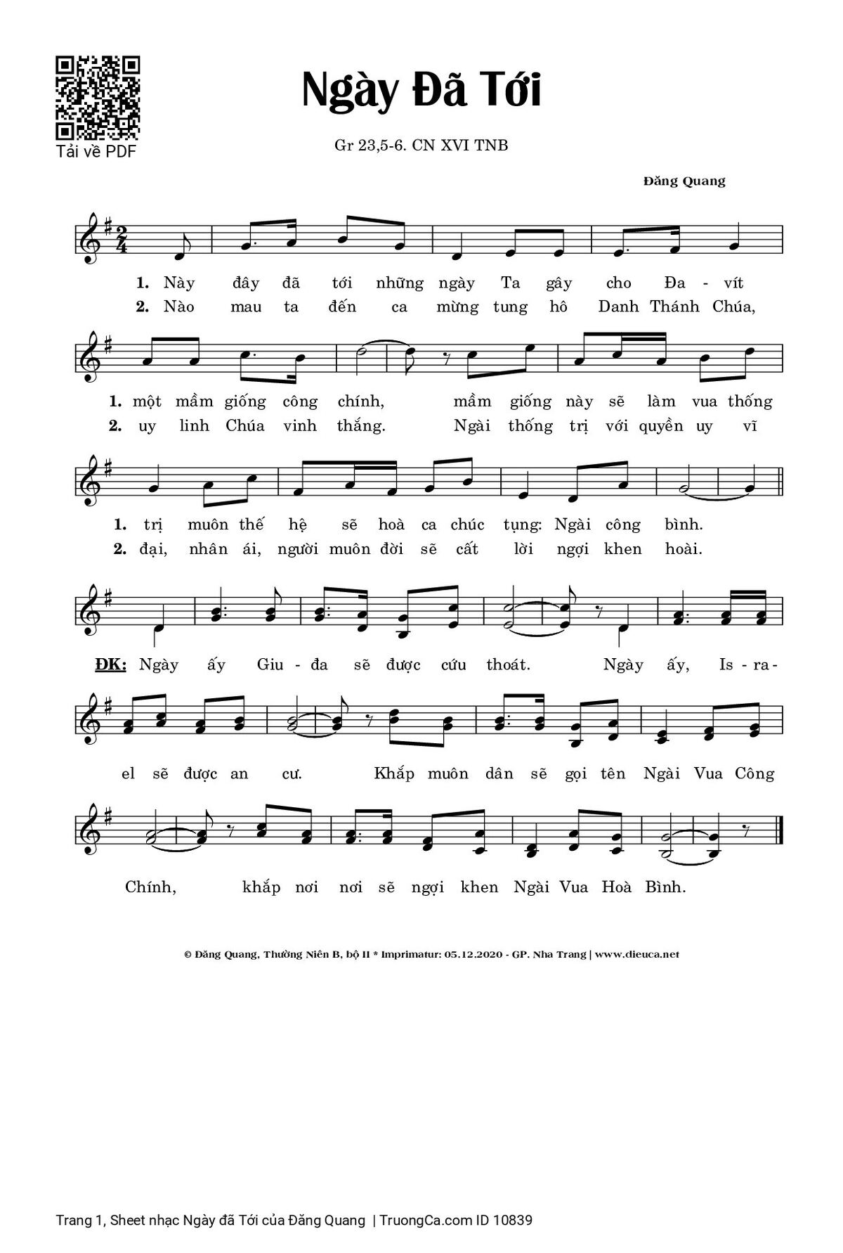 Điệp khúc: Ngày ấy Giu-đa sẽ được cứu thoát. Ngày ấy, Is-ra-el sẽ được an cư. Khắp muôn dân sẽ gọi tên Ngài Vua Công Chính, khắp nơi nơi sẽ ngợi khen Ngài Vua Hoà Bình.