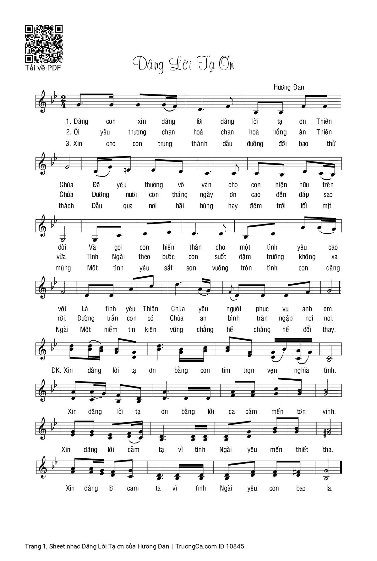 Điệp khúc: Xin dâng lời tạ ơn bằng con tim trọn vẹn nghĩa tình. Xin dâng lời tạ ơn bằng lời ca cảm mến tôn vinh. Xin dâng lời cảm tạ vì tình Ngài yêu mến thiết tha. Xin dâng lời cảm tạ vì tình Ngài yêu con bao la.