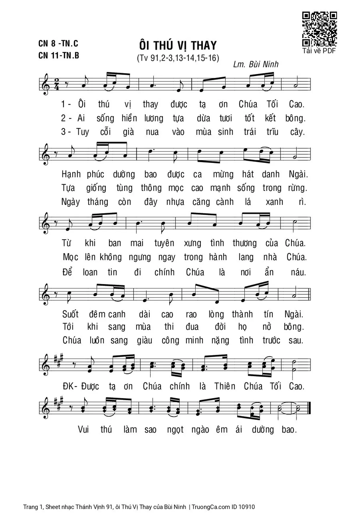 1. Ôi thú vị thay được tạ ơn Chúa Tối Cao. Hạnh phúc dường bao được ca mừng hát danh Ngài. Từ khi ban mai tuyên xưng tình thương của Chúa. Suốt đêm canh dài cao rao lòng thành tín Ngài.