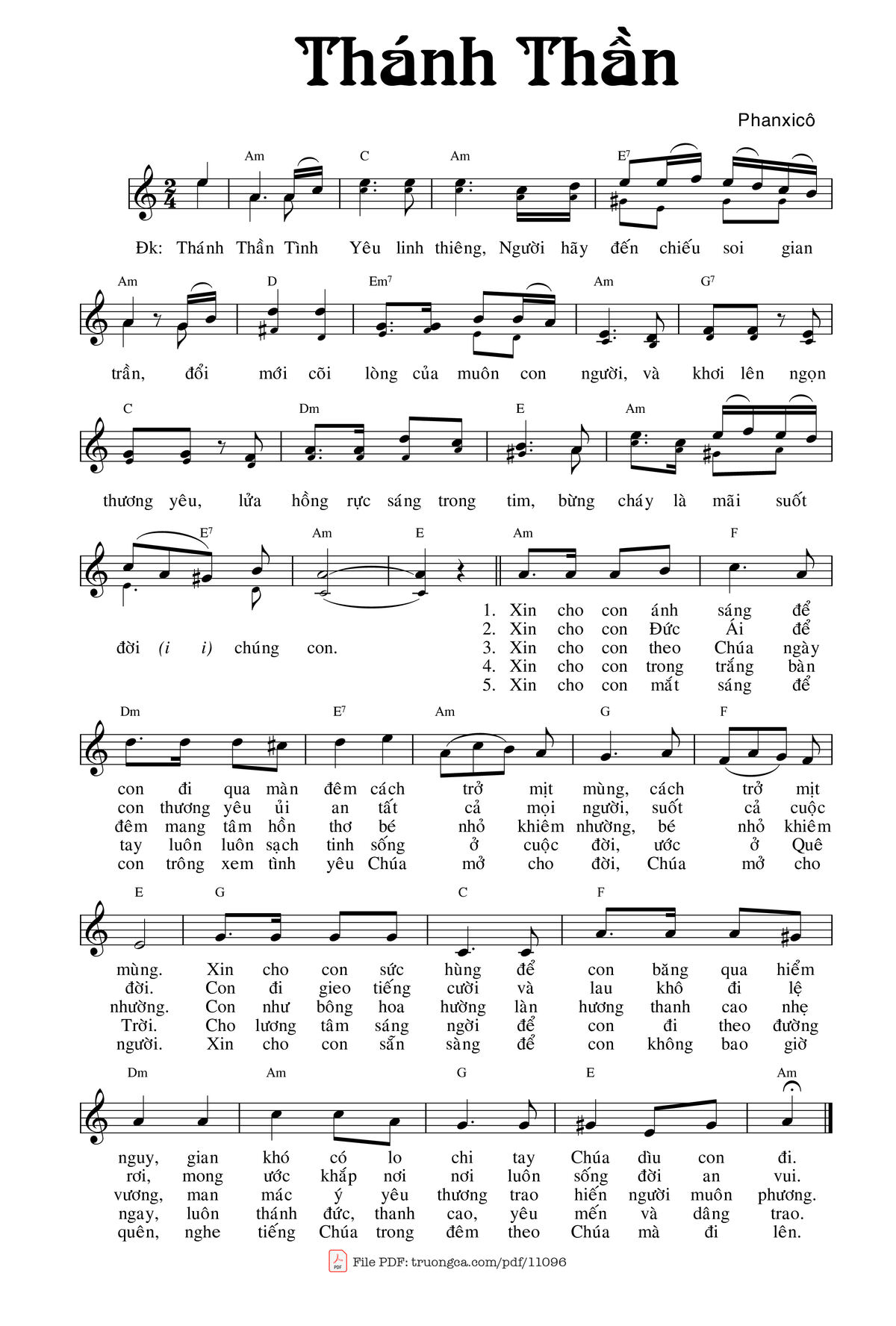 Chọn nút dấu + để tăng tông lên nửa cung, nút dấu - để giảm tông xuống nửa cung. Rê chuột vào hợp âm để xem các thế bấm hợp âm của bài hát Thánh Thần.