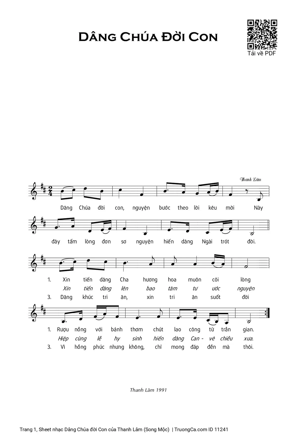 Phần nghe hát Dâng Chúa đời Con (Thanh Lâm (Song Mộc)) được nhúng từ Youtube, Musescore hoặc link ngoài và chịu sự kiểm soát bản quyền của bên thứ ba đó, vì vậy có thể bị xóa hoặc chèn quảng cáo bất kỳ lúc nào. Nếu bạn không nghe - xem được ca sĩ hát tức là đã bị Youtube hoặc Musescore kiểm soát.