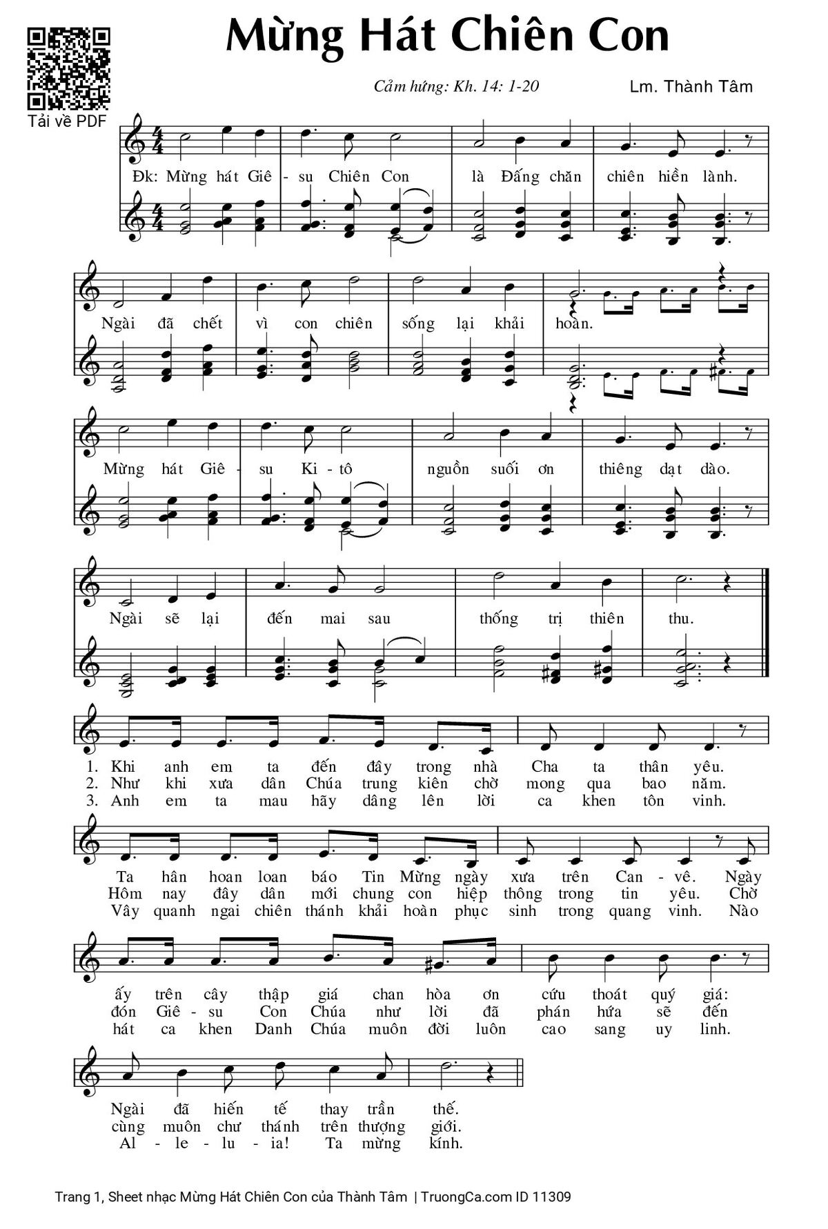 Phần nghe hát Mừng Hát Chiên Con (Thành Tâm) được nhúng từ Youtube, Musescore hoặc link ngoài và chịu sự kiểm soát bản quyền của bên thứ ba đó, vì vậy có thể bị xóa hoặc chèn quảng cáo bất kỳ lúc nào. Nếu bạn không nghe - xem được ca sĩ hát tức là đã bị Youtube hoặc Musescore kiểm soát.