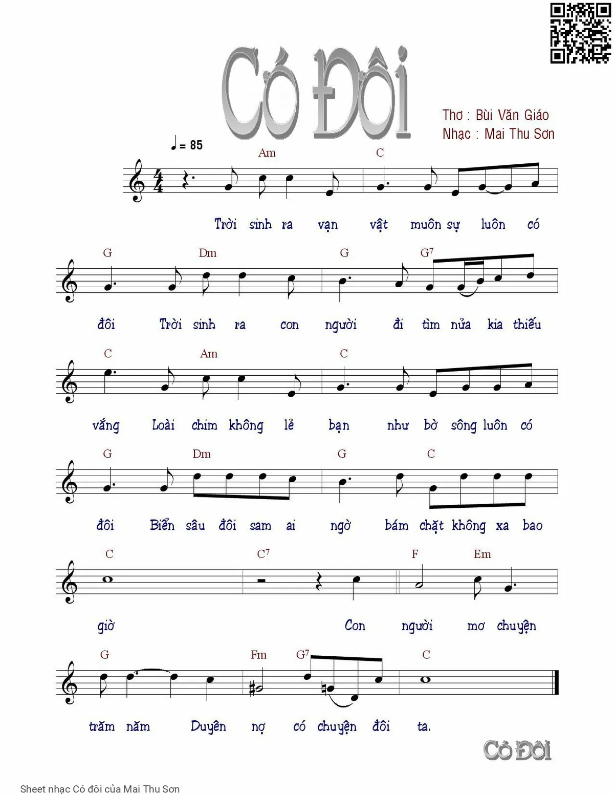 Chọn nút dấu + để tăng tông lên nửa cung, nút dấu - để giảm tông xuống nửa cung. Rê chuột vào hợp âm để xem các thế bấm hợp âm của bài hát Có đôi.