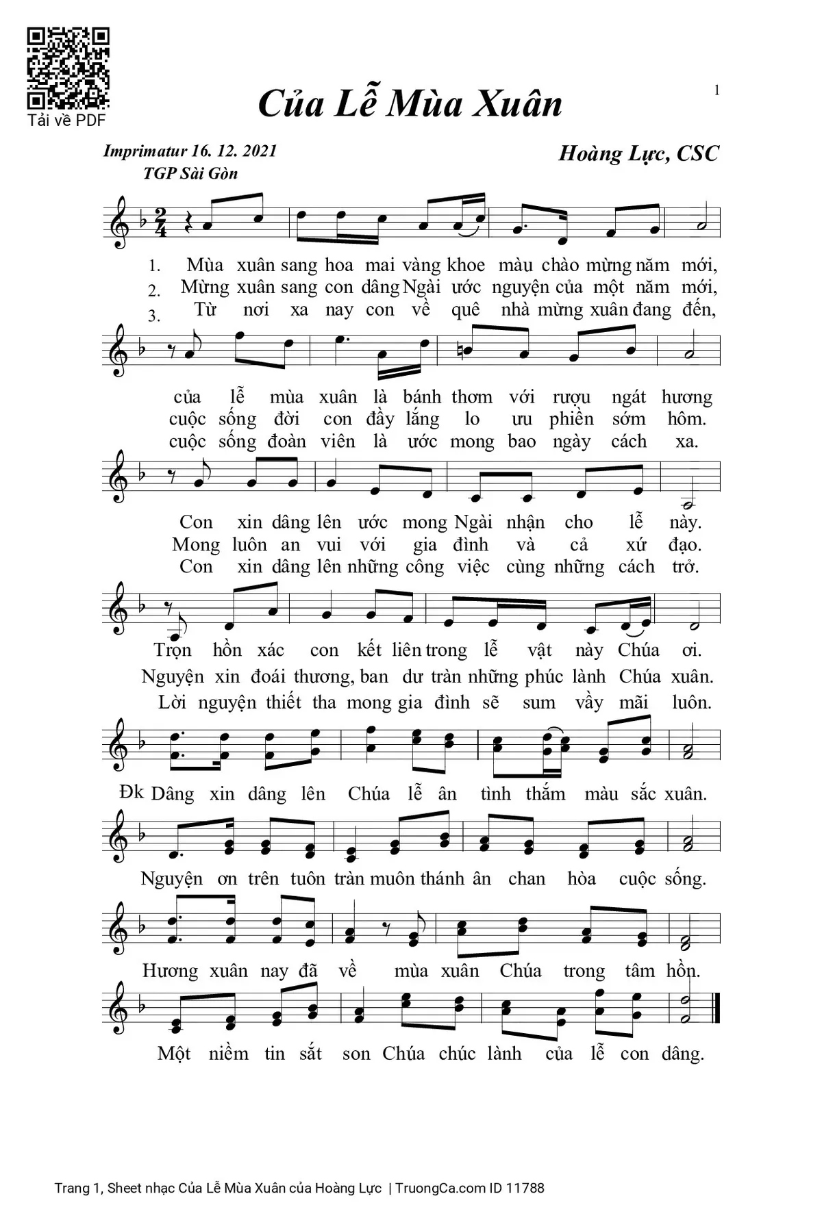 1. Mùa xuân sang hoa mai vàng khoe màu chào mừng năm mới, Của lễ mùa xuân là bánh thơm với rượu ngát hương. Con xin dâng lên ước mong Ngài nhận cho lễ này. Trọn hồn xác con kết liên trong lễ vật này Chúa ơi.