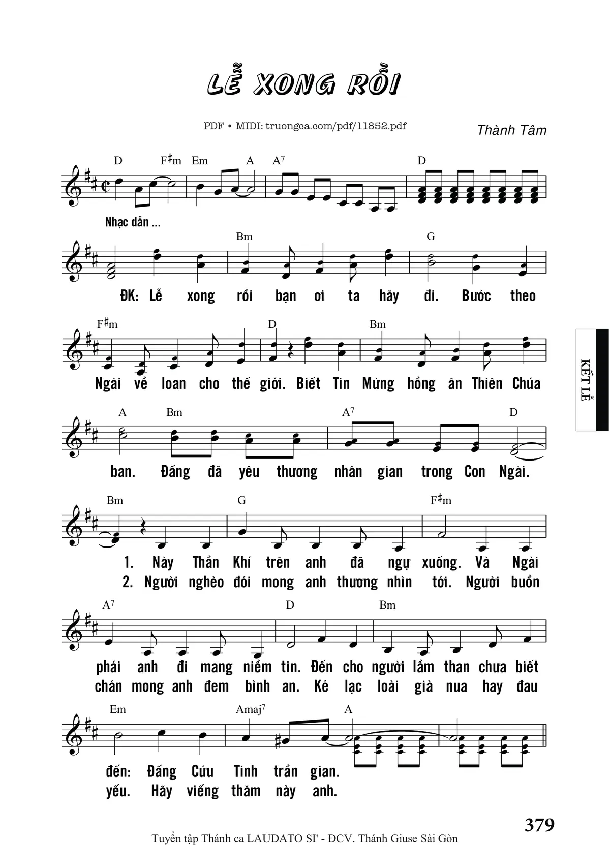 Điệp khúc. Lễ xong rồi bạn ơi ta hãy đi. Bước theo Ngài về loan cho thế giới. Biết Tin Mừng hồng ân Thiên Chúa ban. Đấng đã yêu thương nhân gian trong con Ngài.