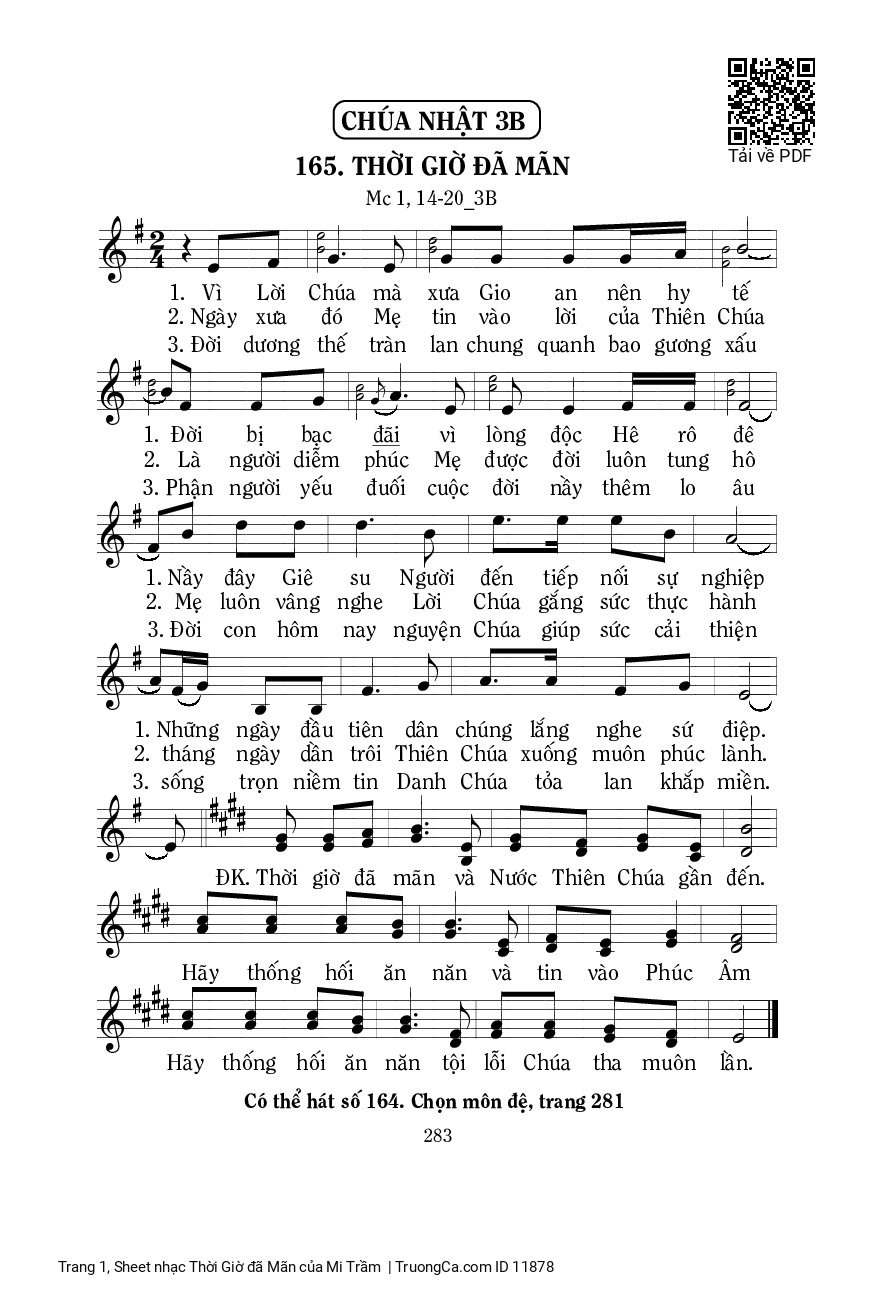 Điệp khúc. Thời gian đã mãn và Nước Thiên Chúa gần đến. Hãy thống hối ăn năn và tin vào Phúc Âm. Hãy thống hối ăn năn tội lỗi Chúa đã tha muôn lần.