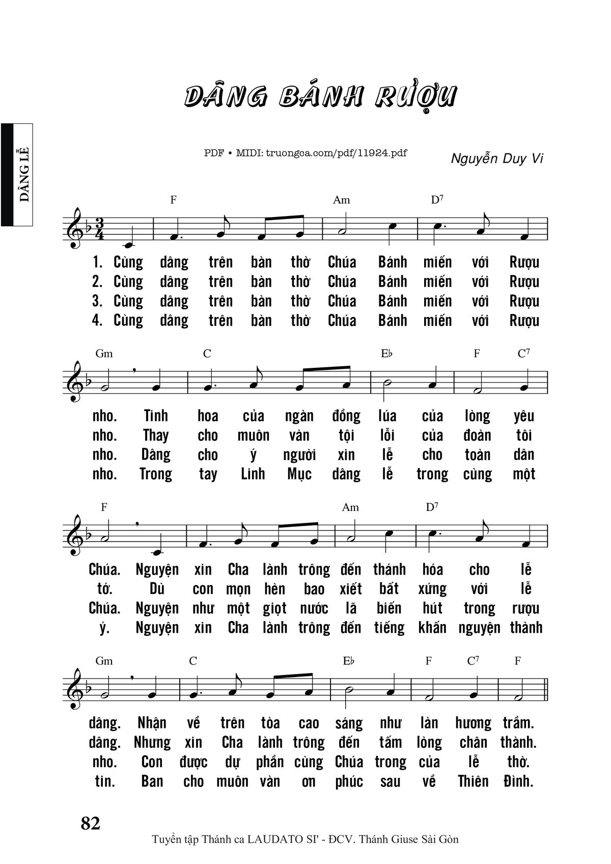 1. Cùng dâng trên bàn thờ Chúa bánh miến với rượu nho, tinh hoa của ngàn đồng lúa, của lòng yêu Chúa. Nguyện xin Cha lành trông đến, thánh hóa cho lễ dâng, nhận về trên tòa cao sáng như làn hương trầm.