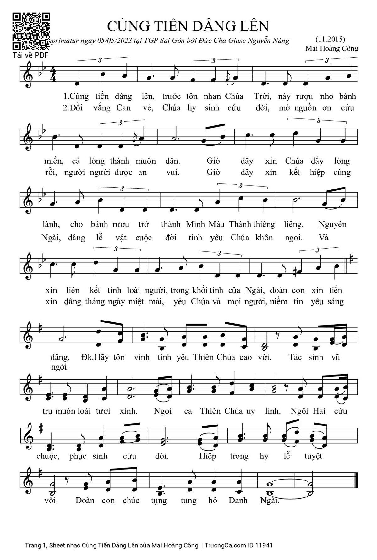 1. Cùng tiến dâng lên, trước thiên nhan Chúa trời, này rượu nho bánh miến, cả lòng thành muôn dân. Giờ đây xin Chúa đầy lòng lành, cho bánh rượu trở thành Mình Máu Thánh thiêng liêng. Nguyện xin liên kết tình loài người, trong khối tình của Ngài, đoàn con xin tiến dâng.