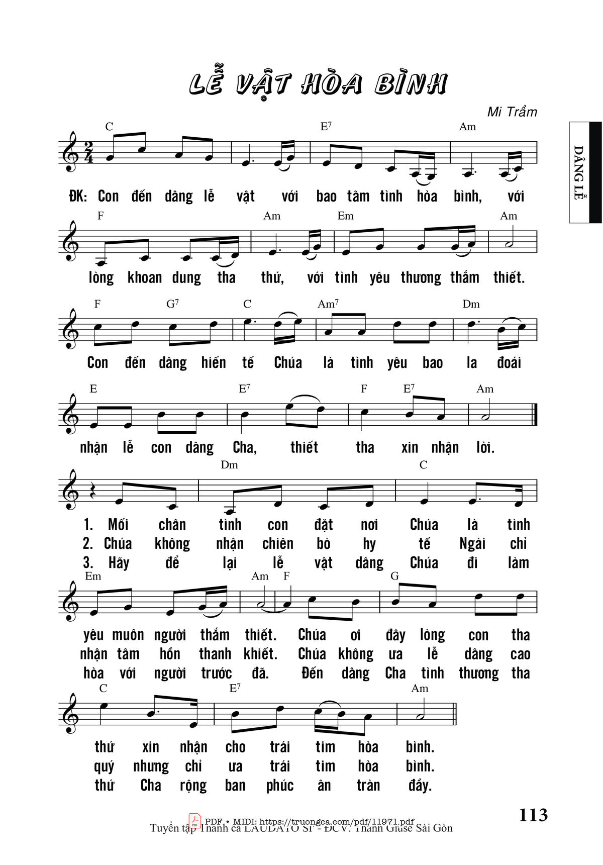 Mi Trầm Con đến dâng lễ vật với ao tâm tình hòa bình [PDF] [Sheet] [Lời H.A] [Mp4/Midi]