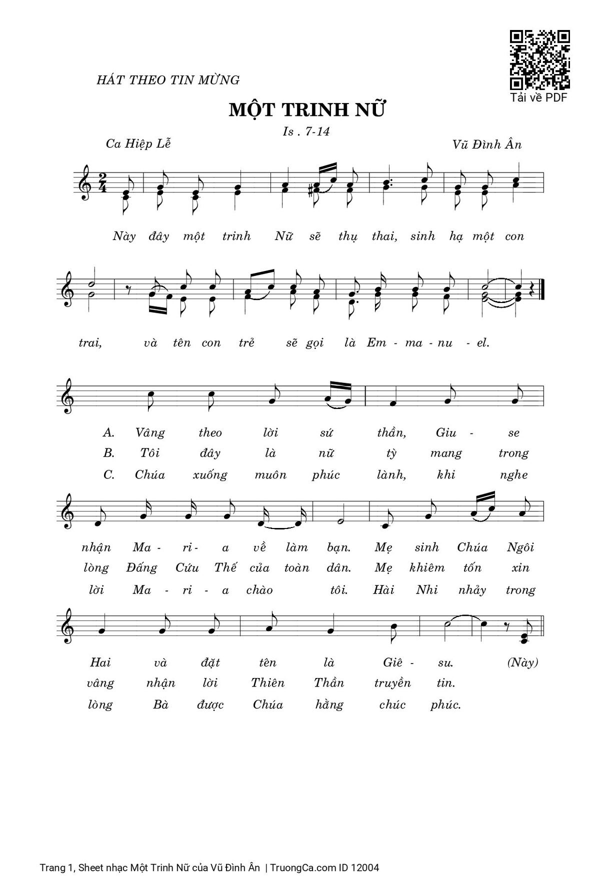 Phần nghe hát Một Trinh Nữ (Vũ Đình Ân) được nhúng từ Youtube, Musescore hoặc link ngoài và chịu sự kiểm soát bản quyền của bên thứ ba đó, vì vậy có thể bị xóa hoặc chèn quảng cáo bất kỳ lúc nào. Nếu bạn không nghe - xem được ca sĩ hát tức là đã bị Youtube hoặc Musescore kiểm soát.