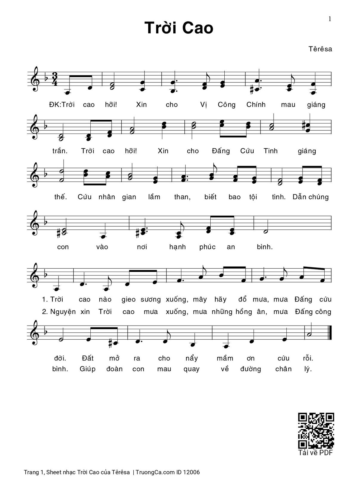 Têrêsa Trời cao hỡi Xin cho Vị Công Chính mau giáng trần [PDF] [Sheet] [Lời H.A] [Mp4/Midi]