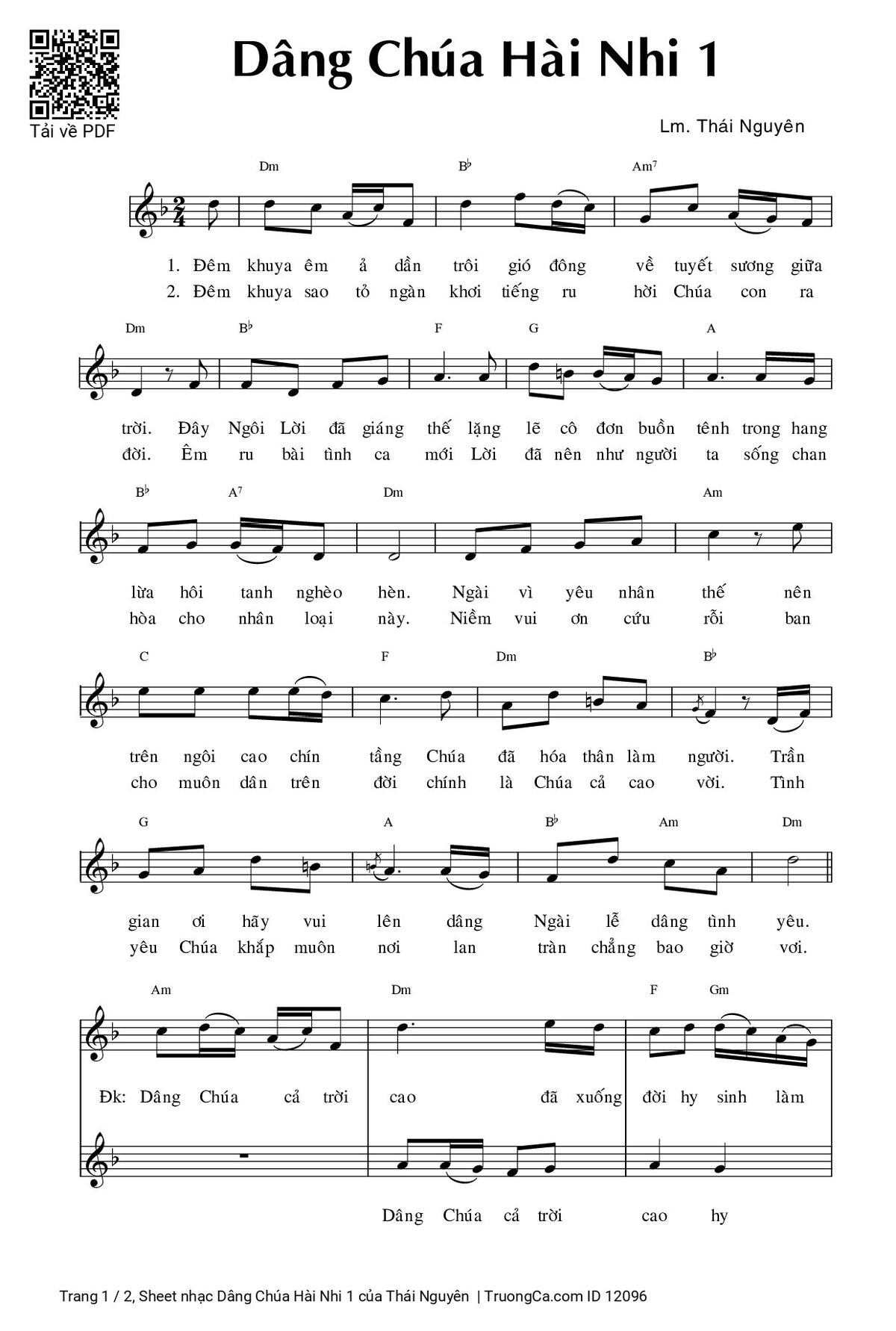 Điệp khúc. Dâng Chúa cả trời cao đã xuống đời hy sinh làm người. Niềm tin lòng con thắp sáng giữa đời còn lắm gian nan. Dâng Thánh Tử Hài Nhi trong nôi hèn đêm khuya mịt mùng, cỏ rơm tình con sưởi ấm giữa trời rét lạnh đêm đông.