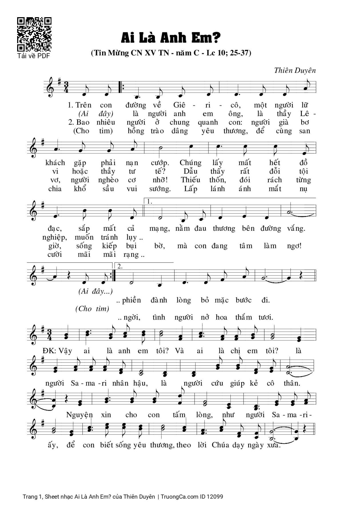Điệp khúc. Vậy ai là anh em tôi? Và ai là chị em tôi? Là người Sa-ma-ri nhân hậu, là người cứu giúp kẻ cô thân. Nguyện xin cho con tấm lòng, như người Sa-ma-ri ấy, để con biết sống yêu thương, theo lời Chúa dạy ngày xưa.