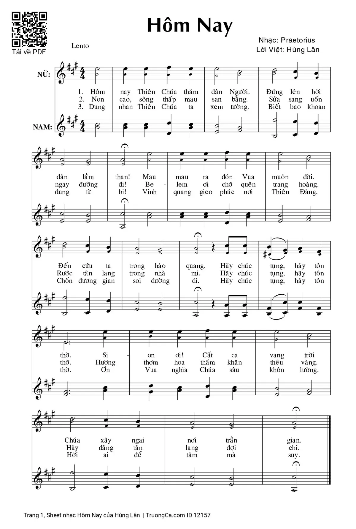 1. Hôm nay Thiên Chúa thăm dân Người, đứng lên hỡi dân lầm than! Mau mau ra đón Vua muôn đời đến cứu ta trong hào quang. Hãy chúc tụng, hãy tôn thờ. Si-on ơi cất ca vang trời. Chúa xây ngai nơi trần gian.