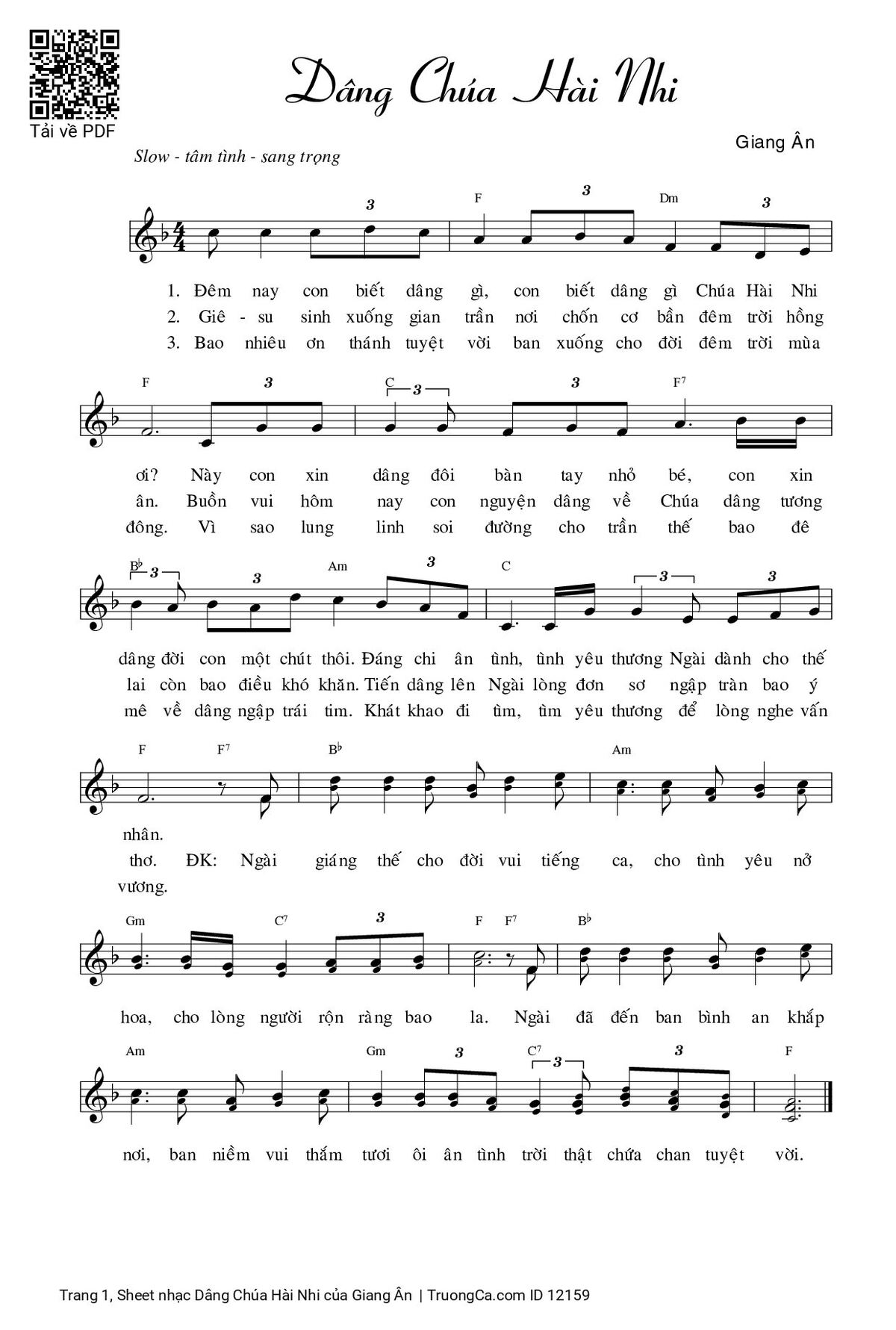 Phần nghe hát Dâng Chúa Hài Nhi (Giang Ân) được nhúng từ Youtube, Musescore hoặc link ngoài và chịu sự kiểm soát bản quyền của bên thứ ba đó, vì vậy có thể bị xóa hoặc chèn quảng cáo bất kỳ lúc nào. Nếu bạn không nghe - xem được ca sĩ hát tức là đã bị Youtube hoặc Musescore kiểm soát.