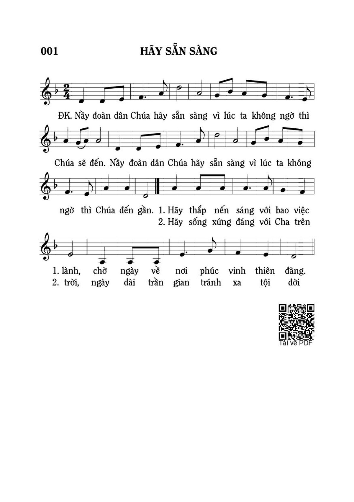 Điệp khúc. Nầy đoàn dân Chúa hãy sẵn sàng vì lúc ta không ngờ thì Chúa sẽ đến. Nầy đoàn dân Chúa hãy sẵn sàng vì lúc ta không ngờ thì Chúa đến gần.