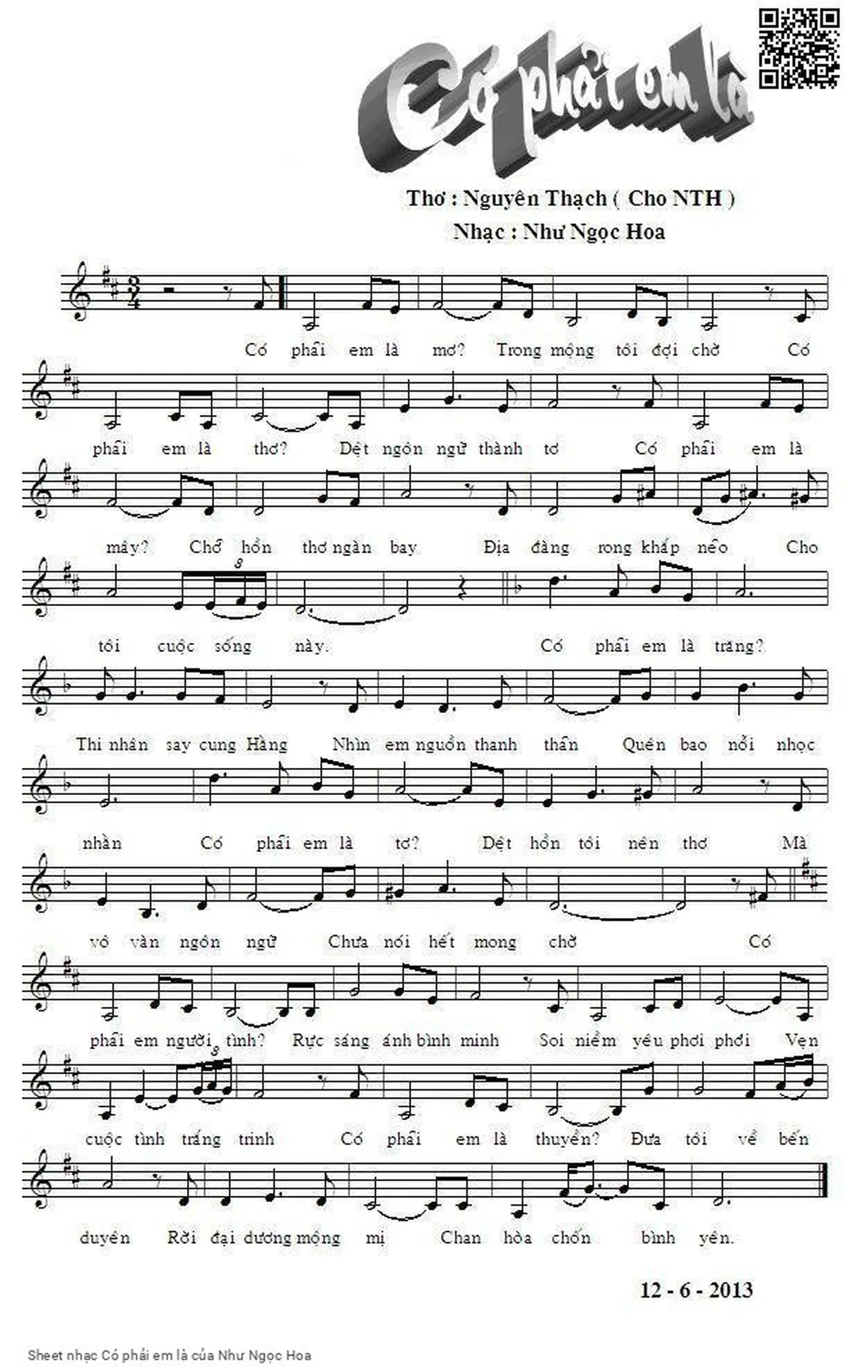 Như Ngọc Hoa Có phải em là mơ Trong mộng tôi đợi chờ [PDF] [Sheet] [Lời H.A] [Mp4/Midi]