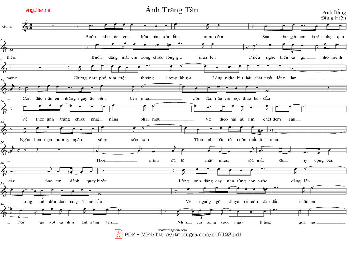 Chọn nút dấu + để tăng tông lên nửa cung, nút dấu - để giảm tông xuống nửa cung. Rê chuột vào hợp âm để xem các thế bấm hợp âm của bài hát Ánh trăng tan.