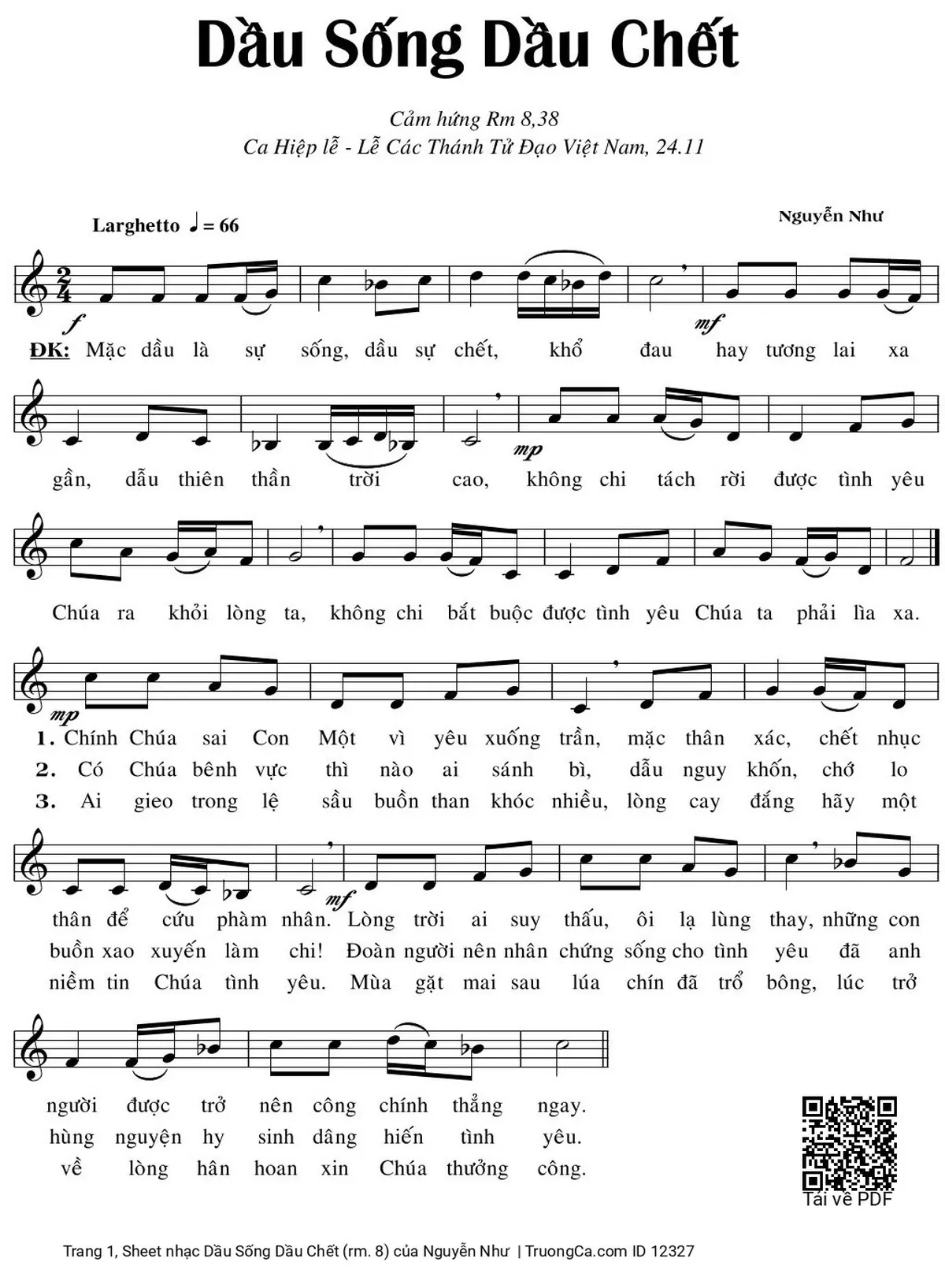 Điệp khúc. Mặc dầu là sự sống, dầu sự chết, khổ đau hay tương lai xa gần, dẫu thiên thần trời cao, không chi tách rời được tình yêu Chúa ra khỏi lòng ta, không chi bắt buộc được tình yêu Chúa ta phải lìa xa.