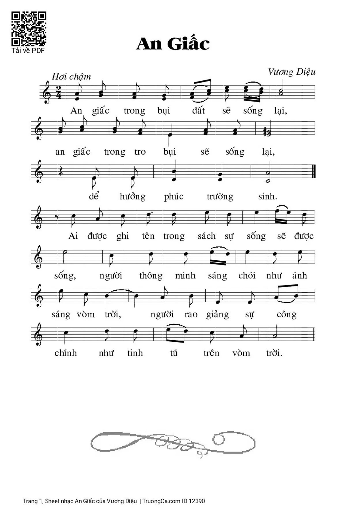 Phần nghe hát An Giấc (Vương Diệu) được nhúng từ Youtube, Musescore hoặc link ngoài và chịu sự kiểm soát bản quyền của bên thứ ba đó, vì vậy có thể bị xóa hoặc chèn quảng cáo bất kỳ lúc nào. Nếu bạn không nghe - xem được ca sĩ hát tức là đã bị Youtube hoặc Musescore kiểm soát.
