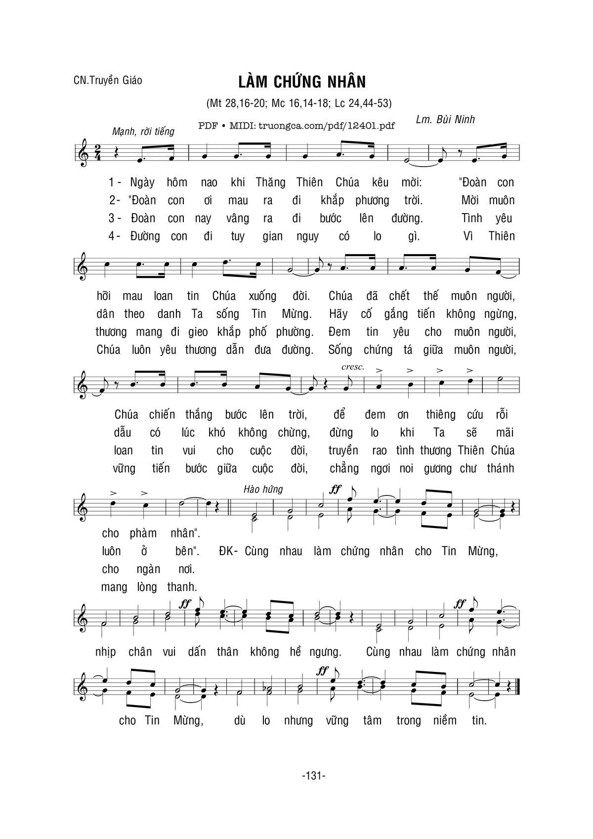 Điệp khúc. Cùng nhau đi làm chứng nhân cho Tin Mừng, nhịp chân vui dấn thân không hề ngưng. Cùng nhau làm chứng nhân cho Tin Mừng, dù lo nhưng vững tâm trong niềm tin.