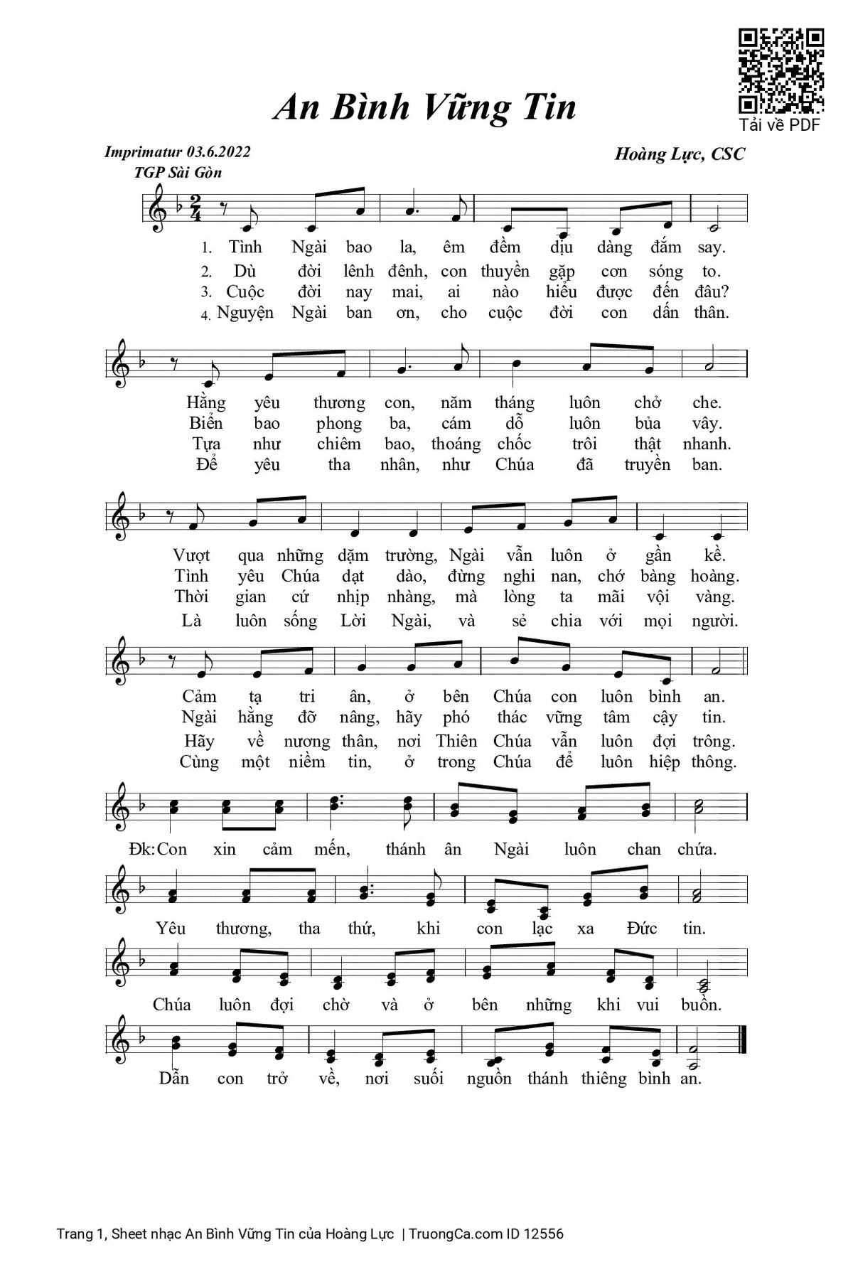 Chọn nút dấu + để tăng tông lên nửa cung, nút dấu - để giảm tông xuống nửa cung. Rê chuột vào hợp âm để xem các thế bấm hợp âm của bài hát An Bình Vững Tin.