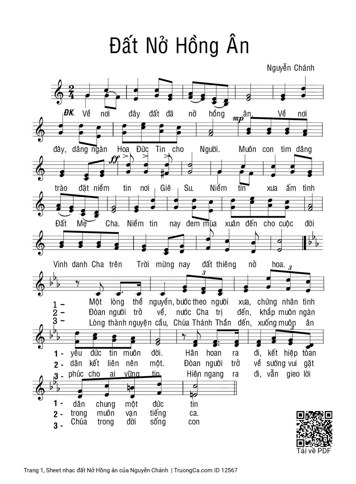 Điệp khúc. Về nơi đây đất đã nở hồng ân. Về nơi đây dâng ngàn Hoa Đức Tin cho Người. Muôn con tim dâng trào đặt niềm tin nơi Giê-su. Niềm tin xưa ấm tình Đất Mẹ Cha. Niềm tin nay đem mùa xuân đến cho cuộc đời. Vinh danh Cha trên Trời mừng nay đất thiêng nở hoa.
