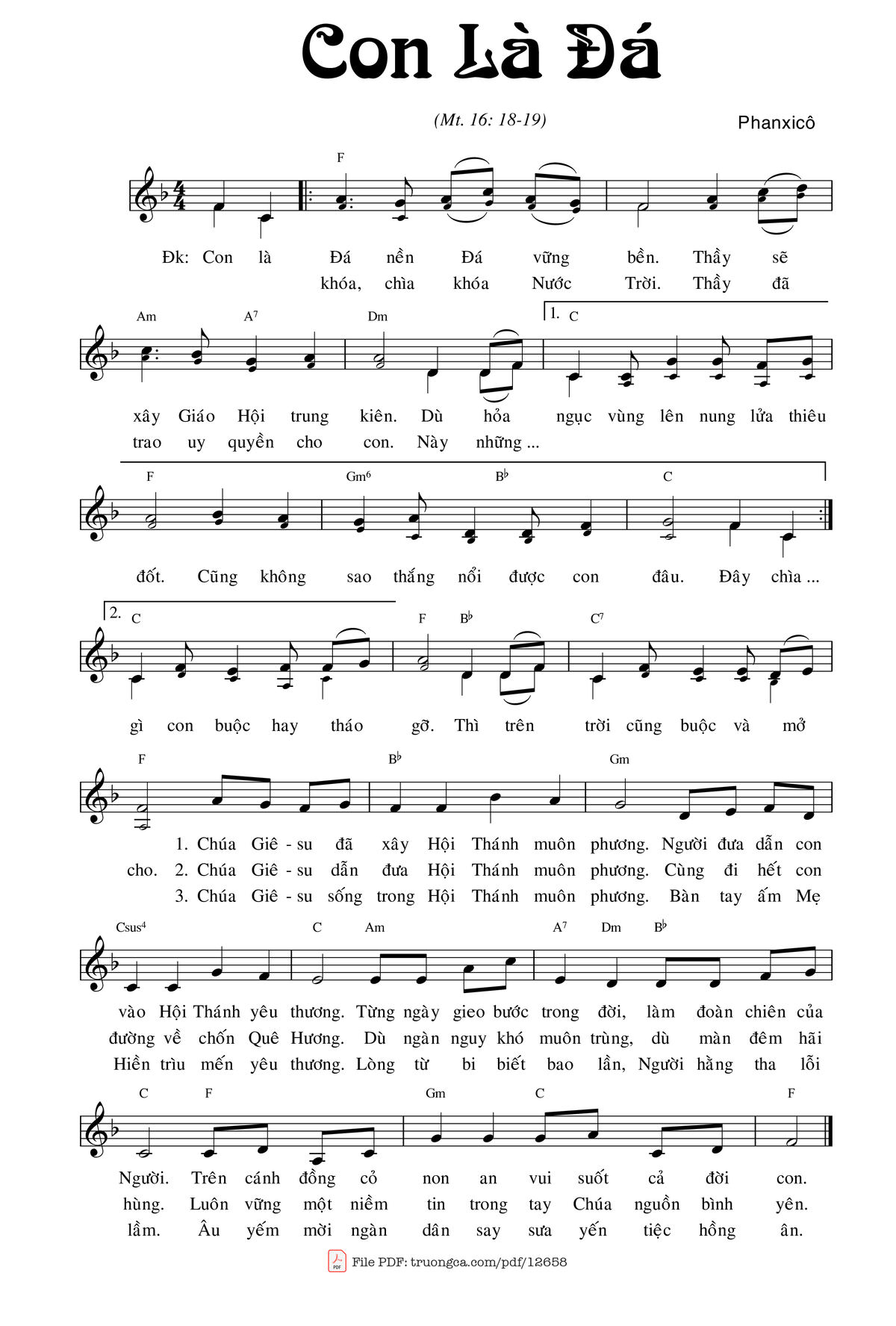 Điệp khúc. Con là Đá, nền Đá vững bền, Thầy sẽ xây Giáo Hội trung kiên. Dù hỏa ngục vùng lên nung lửa thiêu đốt cũng không sao thắng nổi được con đâu. Đây chìa khóa, chìa khóa Nước Trời, Thầy đã trao uy quyền cho con. Này những gì con buộc hay tháo gỡ, thì trên trời cũng buộc và mở cho.
