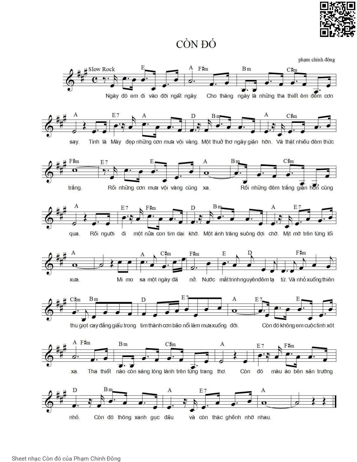 Phần nghe hát Còn đó (Phạm Chinh Đông) được nhúng từ Youtube, Musescore hoặc link ngoài và chịu sự kiểm soát bản quyền của bên thứ ba đó, vì vậy có thể bị xóa hoặc chèn quảng cáo bất kỳ lúc nào. Nếu bạn không nghe - xem được ca sĩ hát tức là đã bị Youtube hoặc Musescore kiểm soát.
