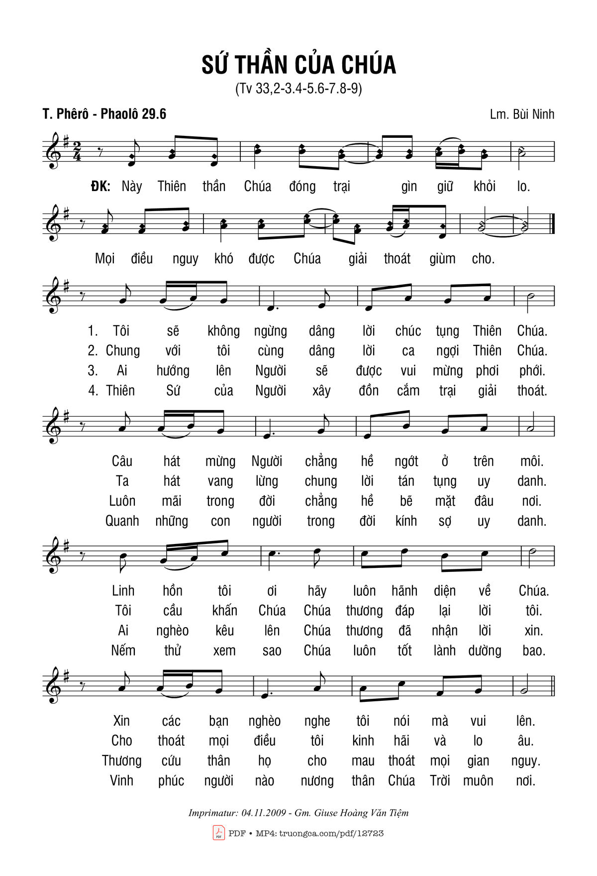Điệp khúc. Này Thiên thần Chúa đóng trại gìn giữ khỏi lo. Mọi điều nguy khó được Chúa giải thoát giùm cho.